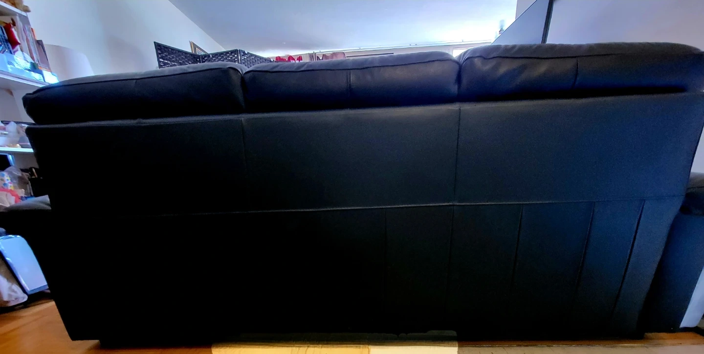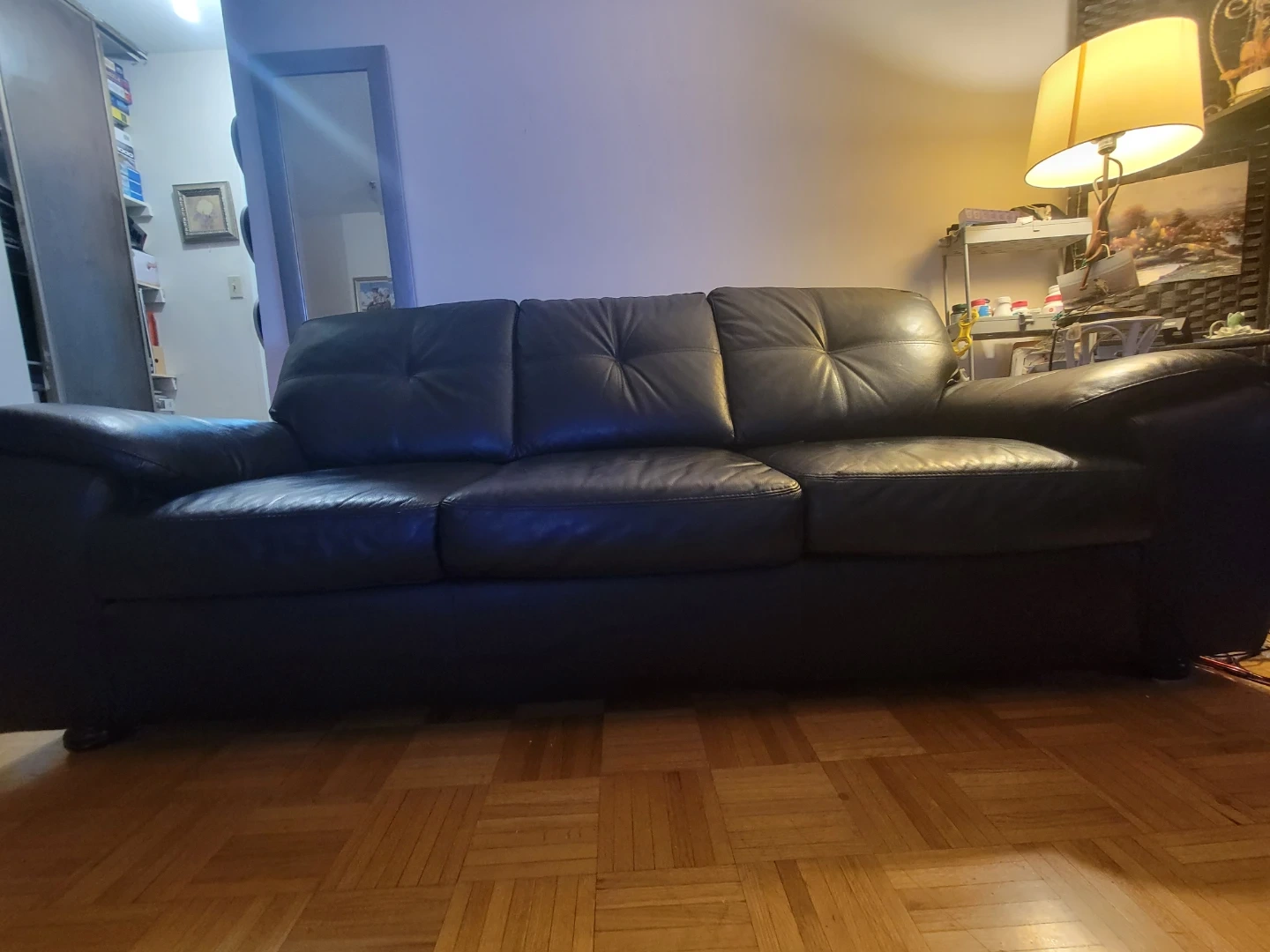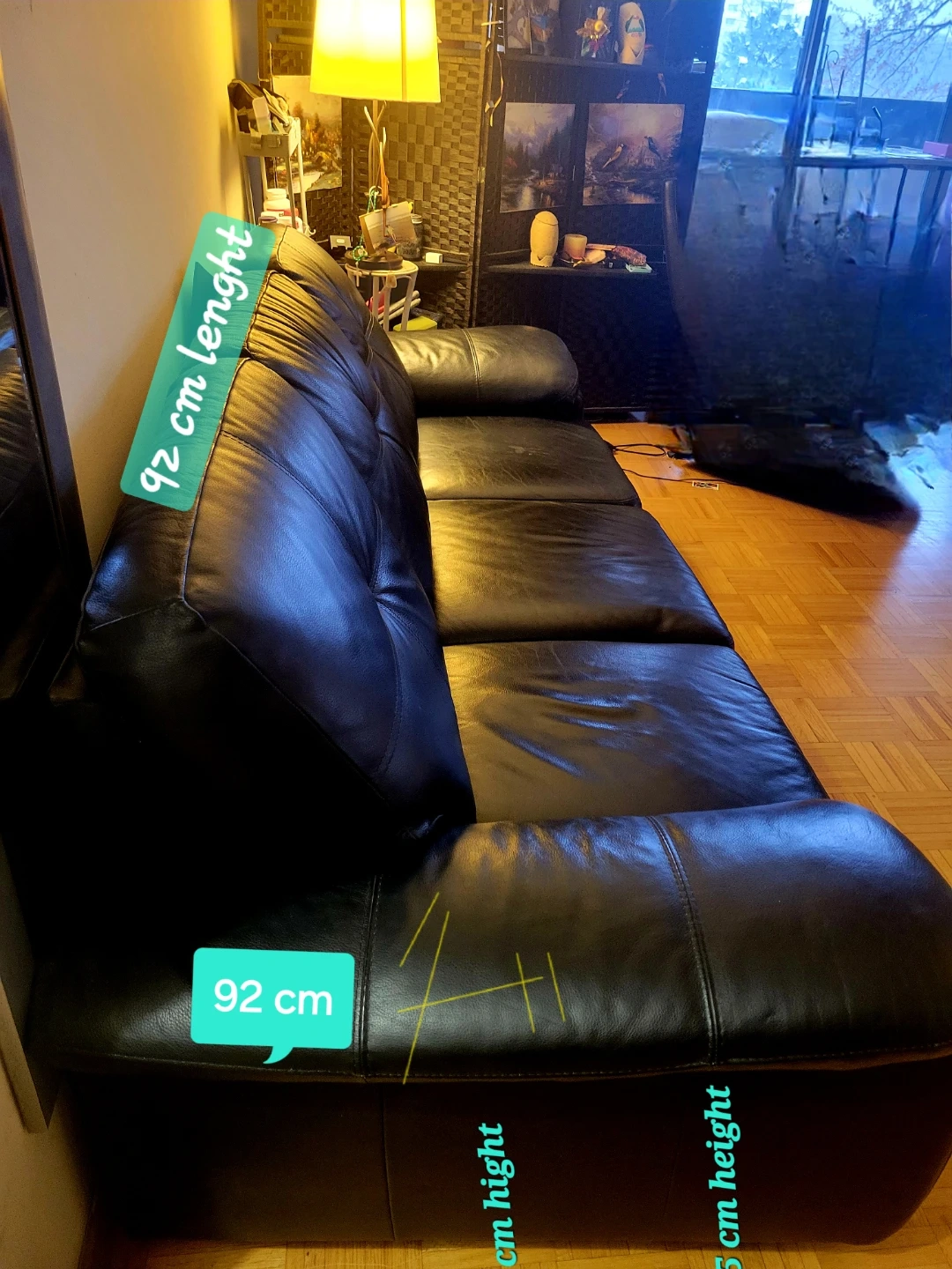 Selling a comfy black leather sofa! The dimensions are approximately 92cm in height and .222 cm in length Perfect for a living room or den!
