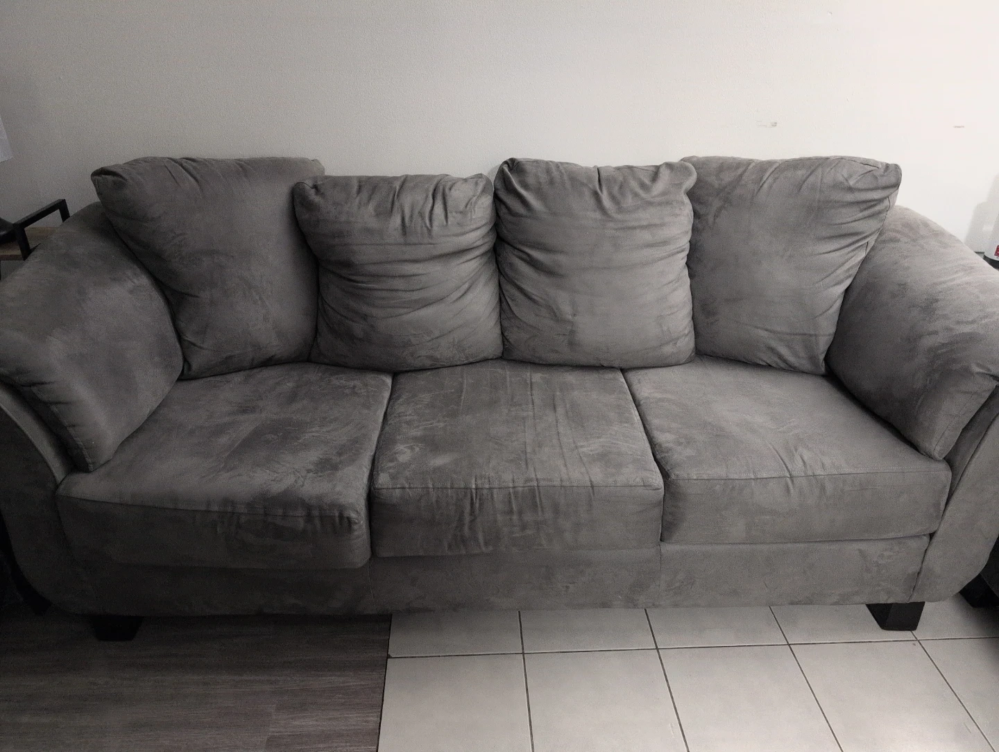 Selling a comfy grey three-seater sofa. It's in great condition and perfect for a living room or den. The cushions are soft and supportive, making it a great place to relax after a long day!