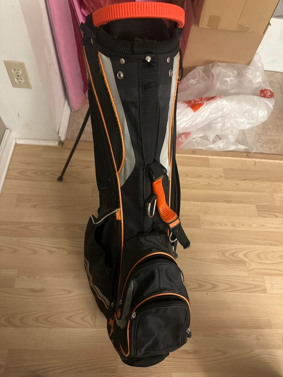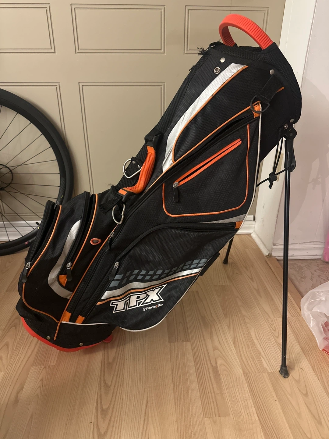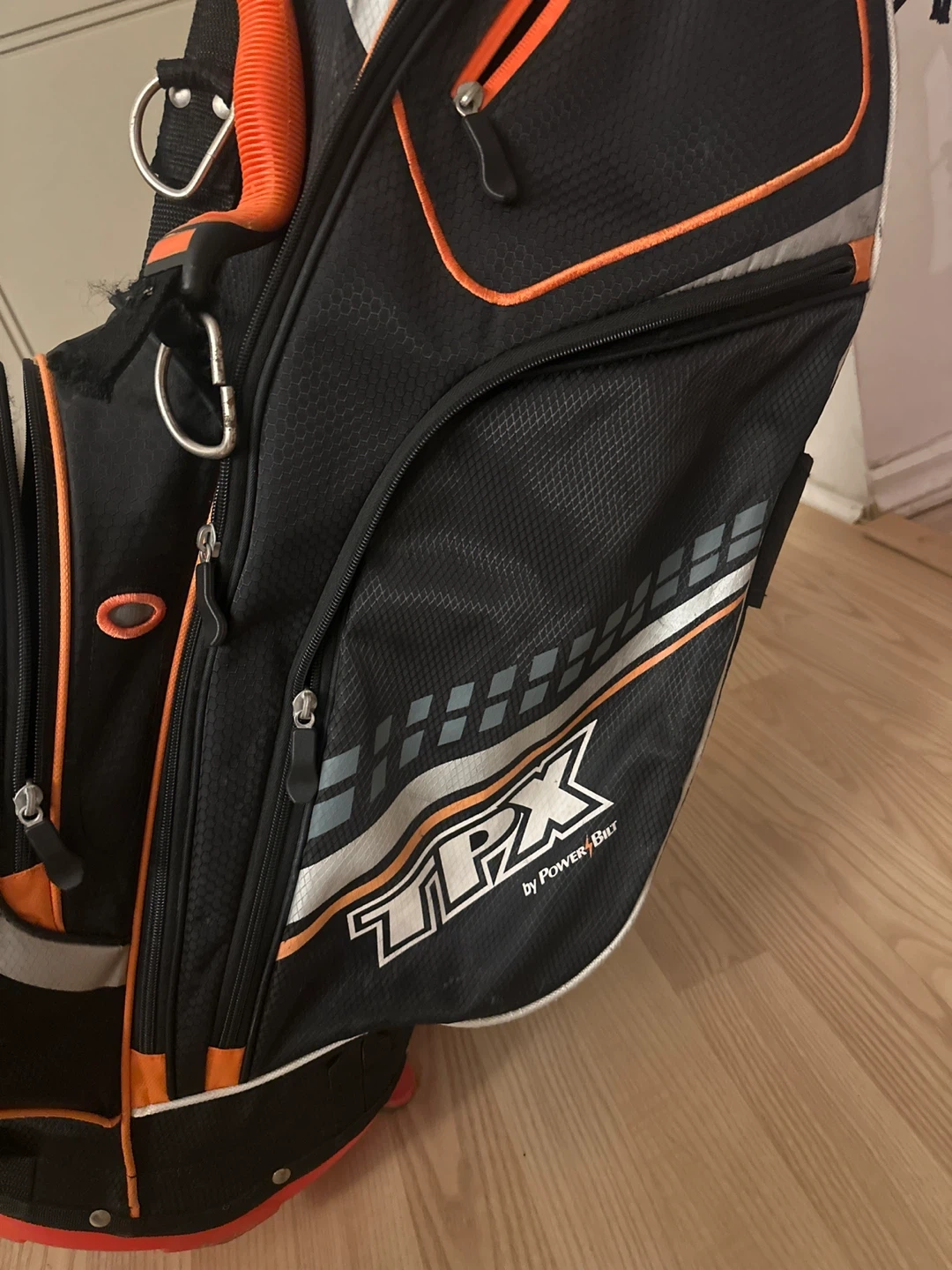 Selling a TPX by Powerbilt golf stand bag. It's black with orange and silver accents. The bag has some wear and tear, as shown in the photos, but it's still functional for carrying your clubs around the course