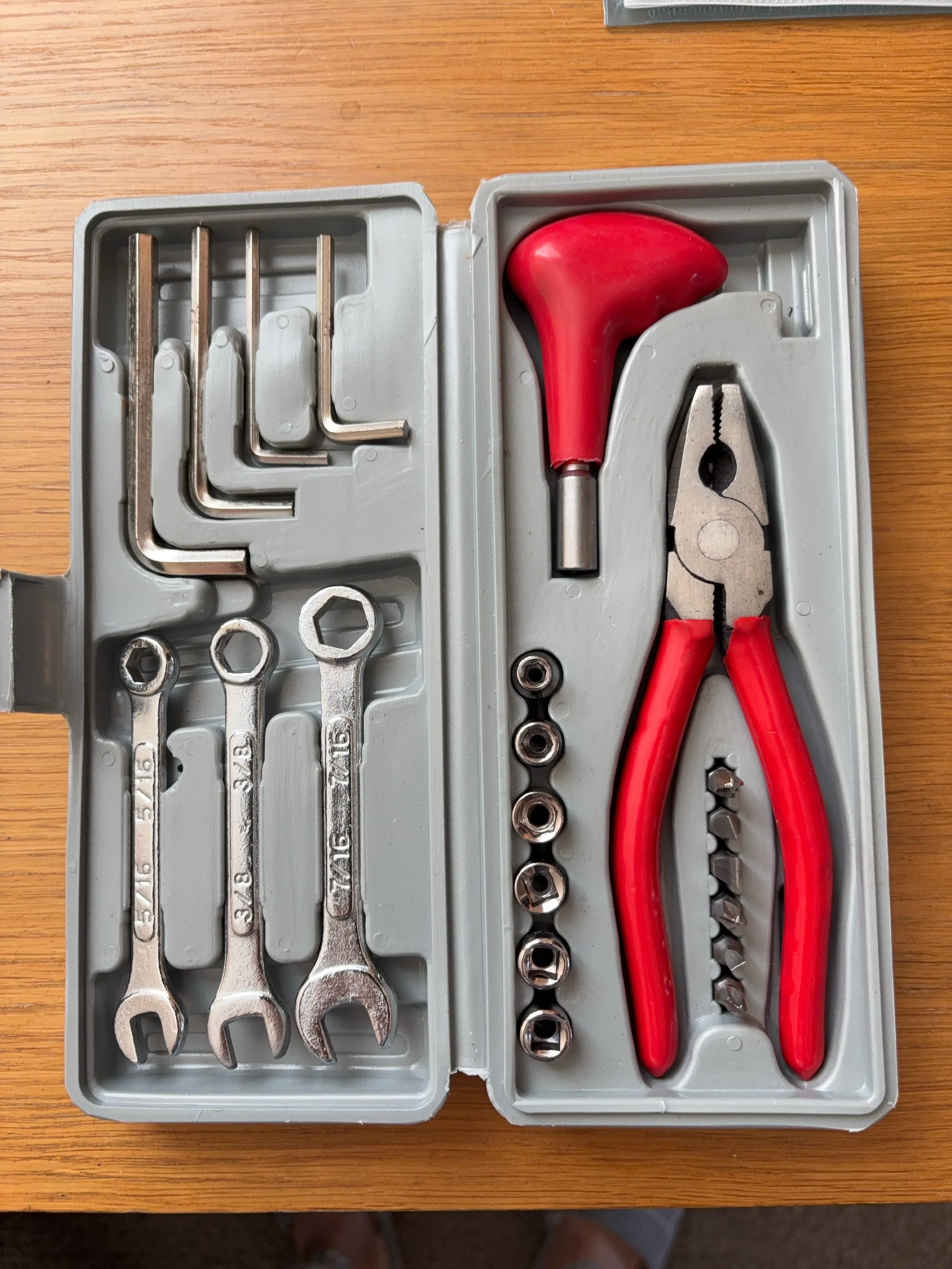 Selling a new tool set that includes wrenches, pliers, and screwdriver bits. The set comes in a grey plastic case with a red handled pliers and a red handled screwdriver. The wrenches are sizes 5/16, 3/8, and 7/16. There are also various Allen wrenches and screwdriver bits included.