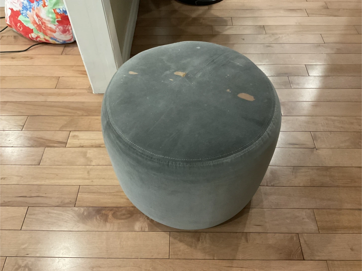 Selling a grey round velvet ottoman. It's a stylish and comfortable piece for any living space. There are some signs of wear on top, as shown in the pictures.