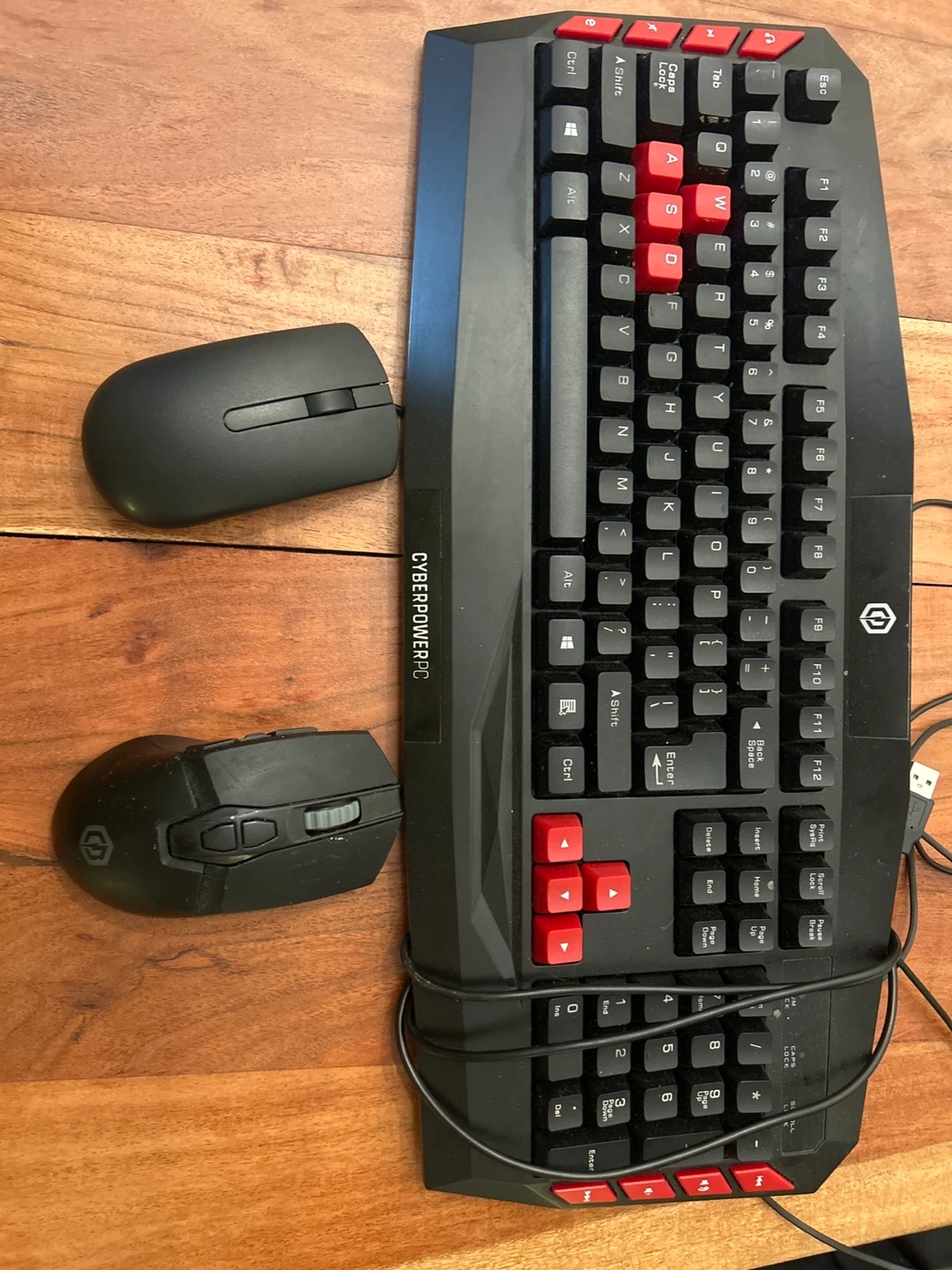 Selling a CyberpowerPC gaming keyboard and mouse combo. The keyboard has red accents on some of the keys. Both items are in good working condition and ready for a new setup