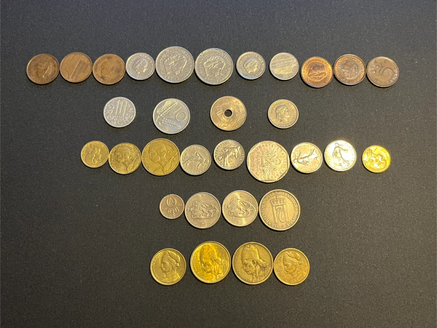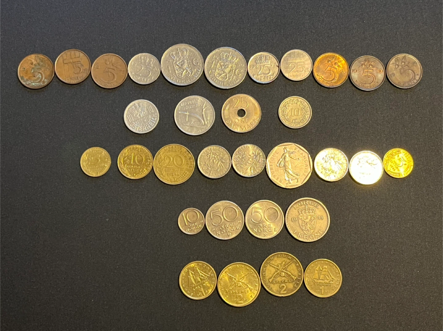 An assortment of European coins, including (from top to bottom, left to right of photos):
