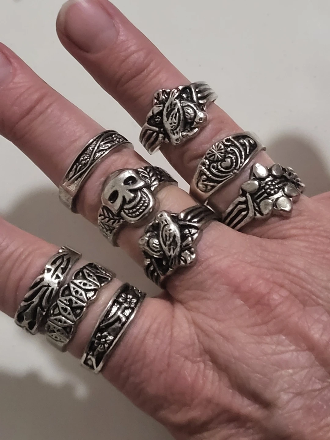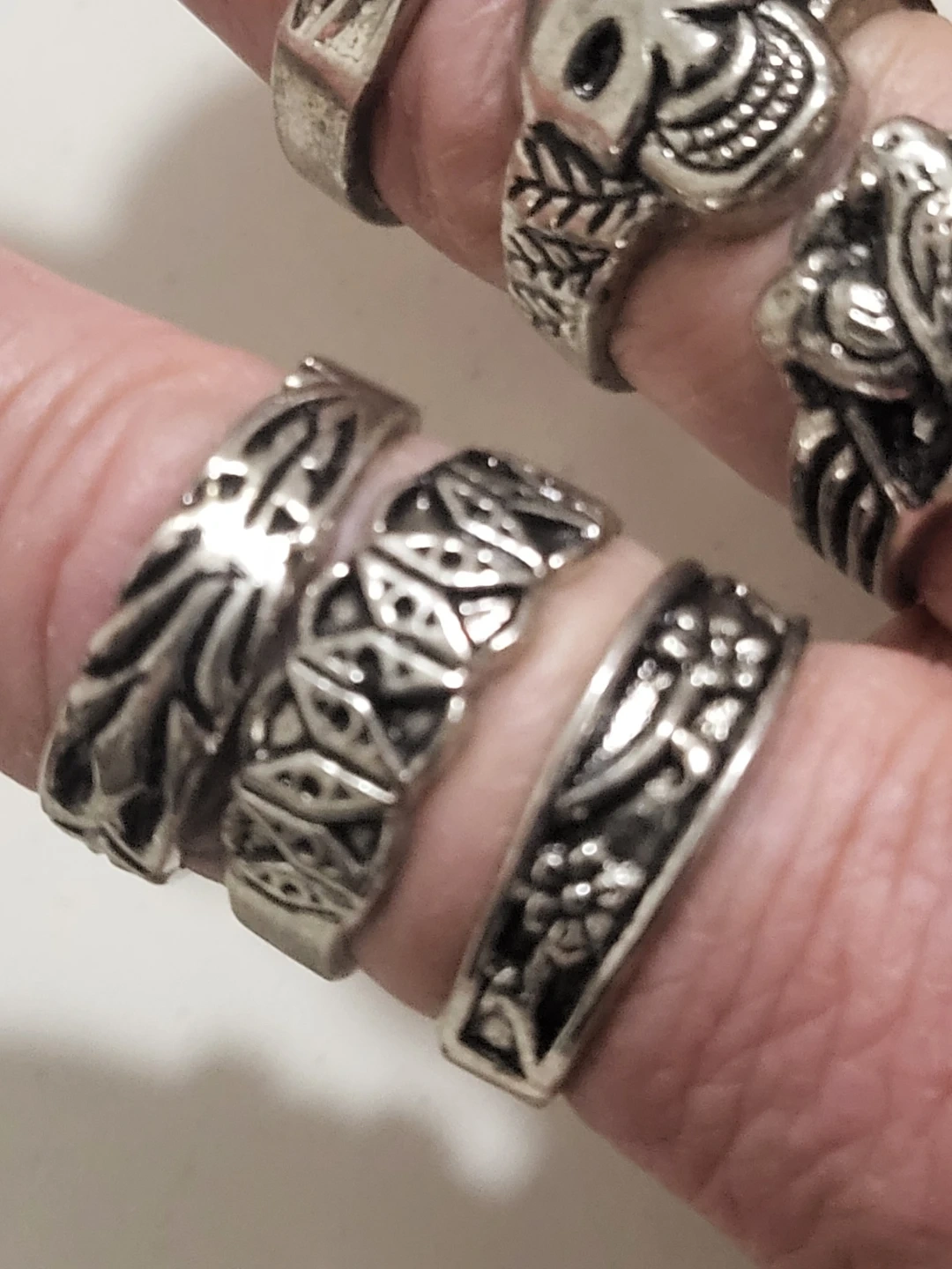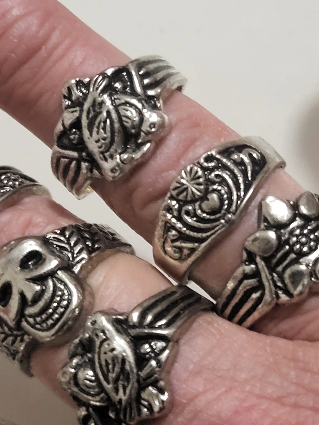 Selling a collection of assorted silver-tone rings. They feature various designs, including skulls, floral patterns, and geometric shapes. Great for adding a unique touch to your style!