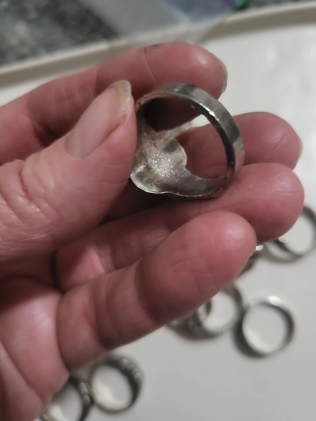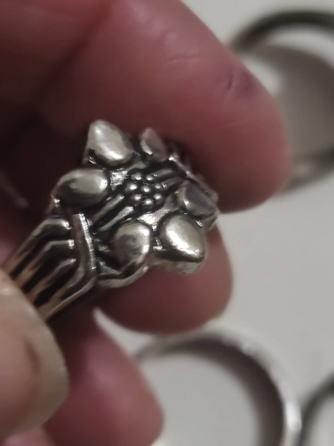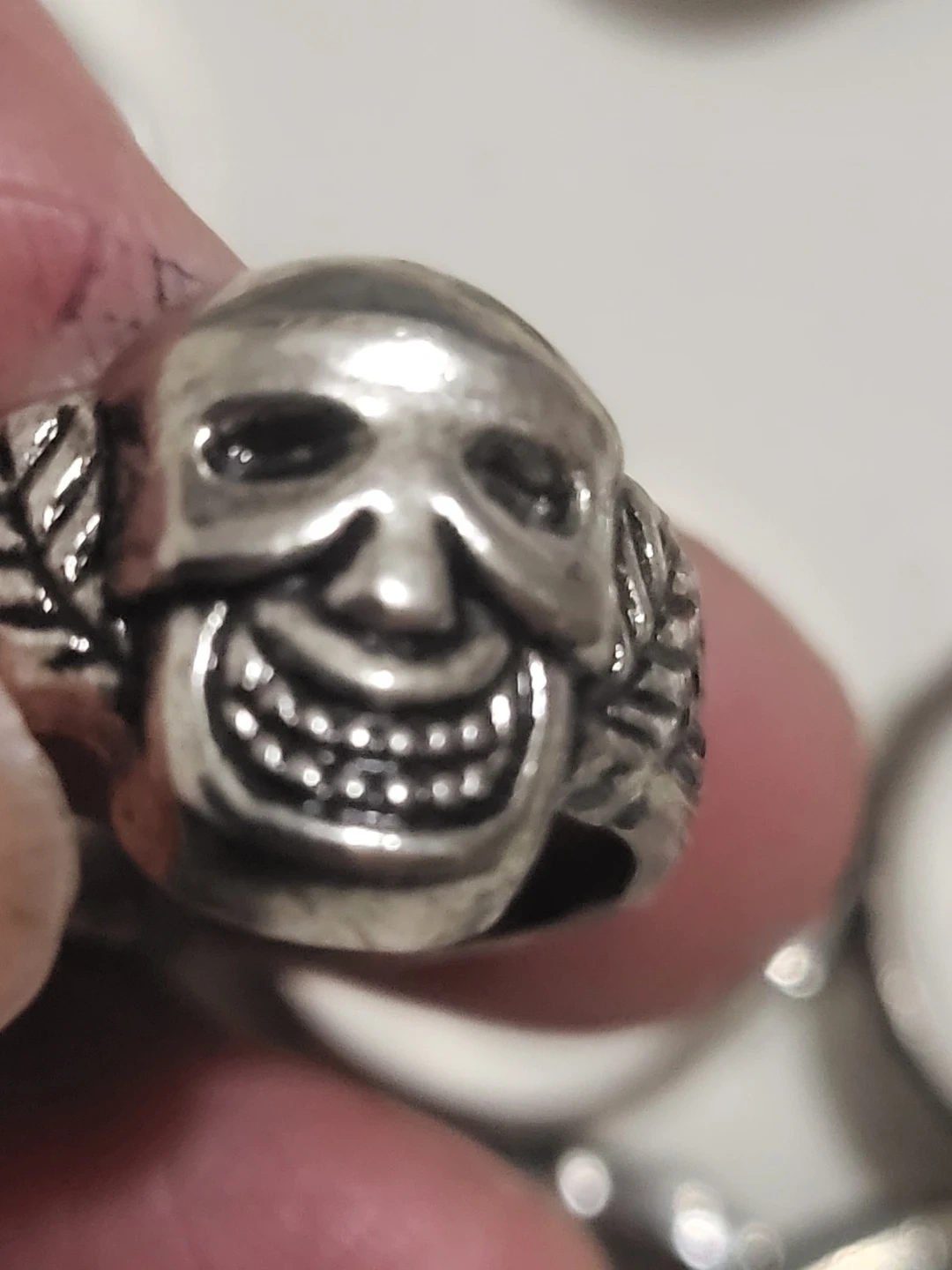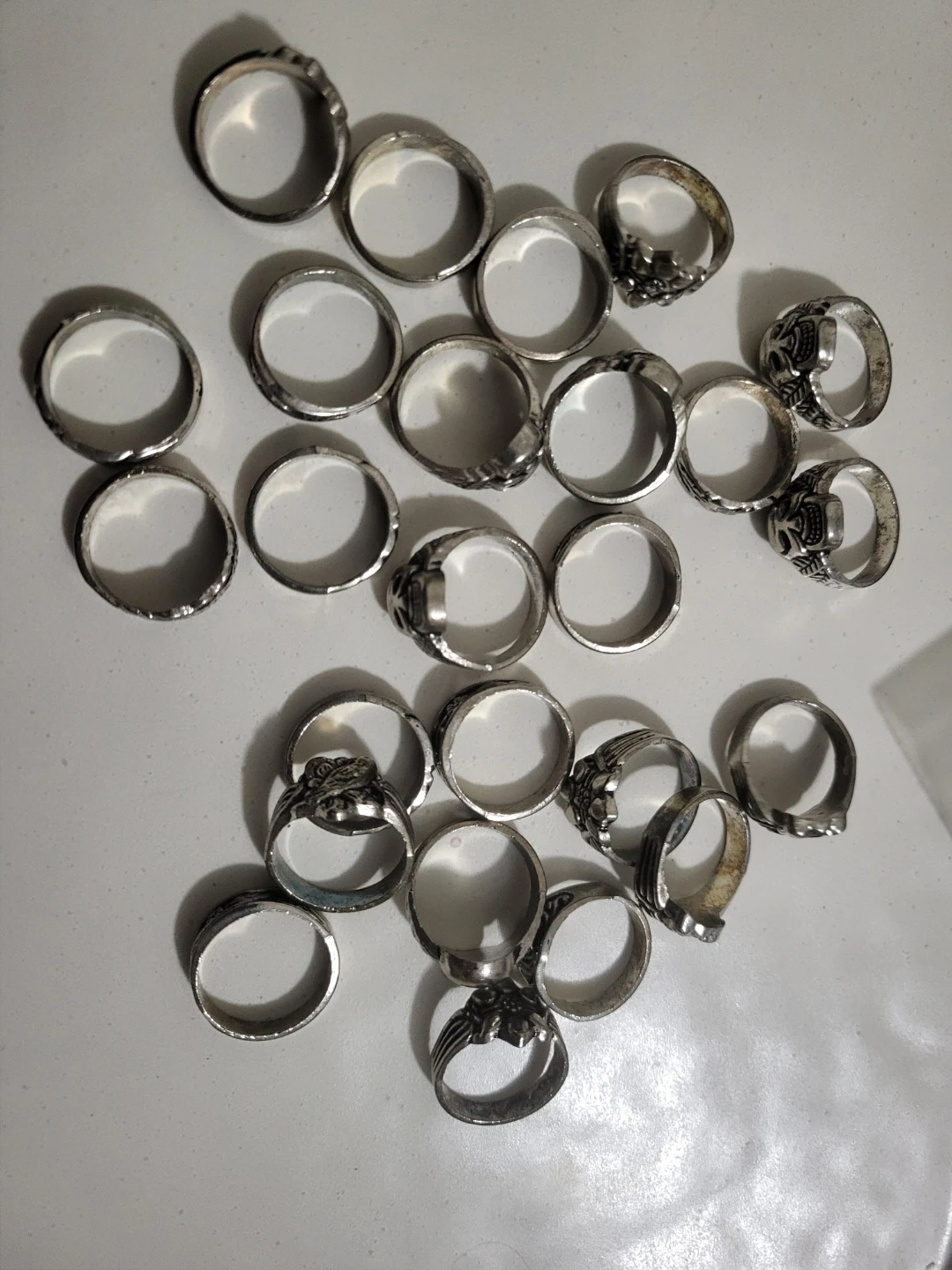 Selling a collection of assorted silver-tone rings. They feature various designs, including skulls, floral patterns, and geometric shapes. Great for adding a unique touch to your style!