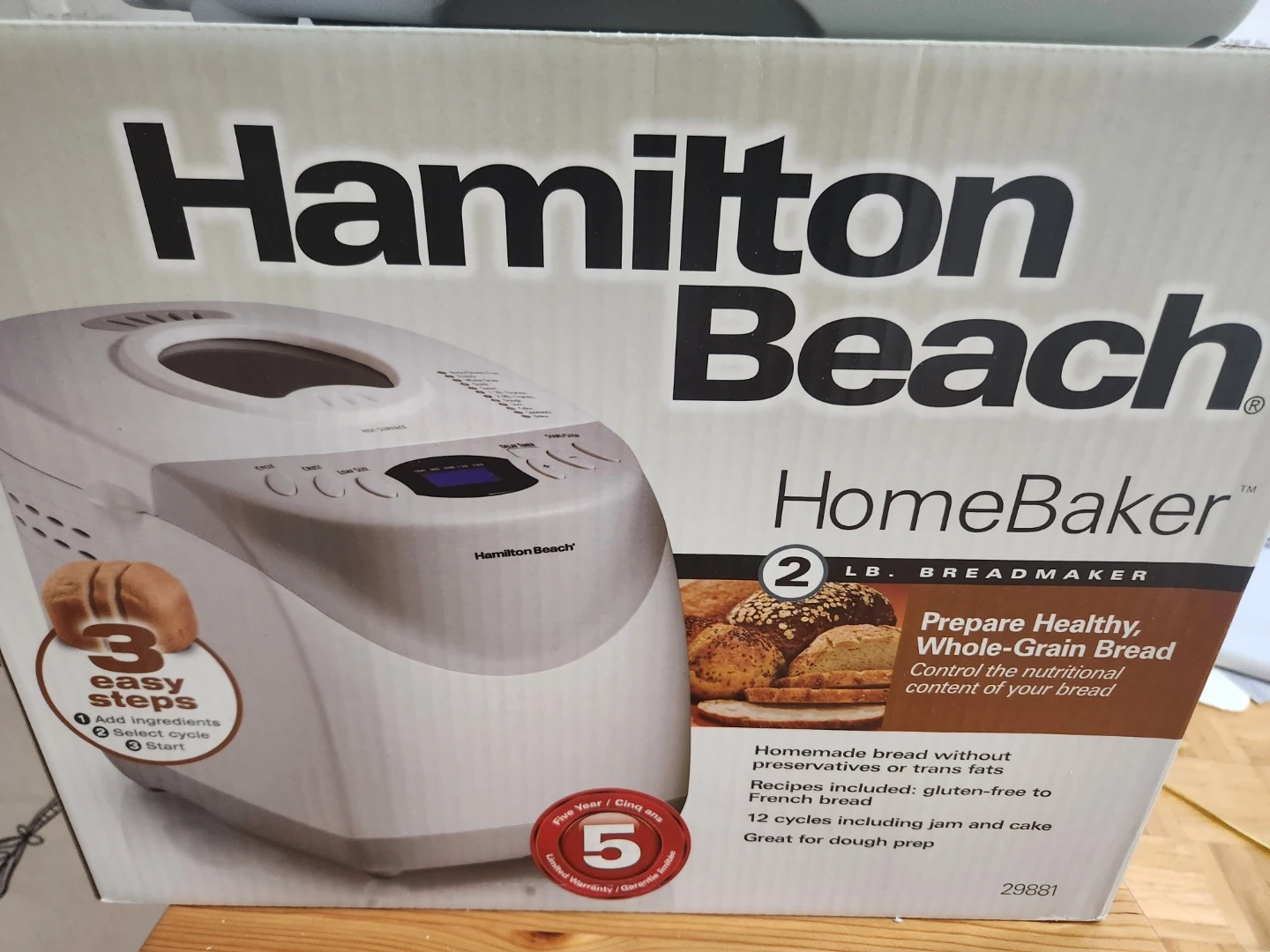 Selling a Hamilton Beach HomeBaker breadmaker! It's in great condition and comes with the original box. It makes up to a 2 lb loaf and has 12 cycles including gluten-free and French bread options. Perfect for making homemade bread without preservatives or trans fats!