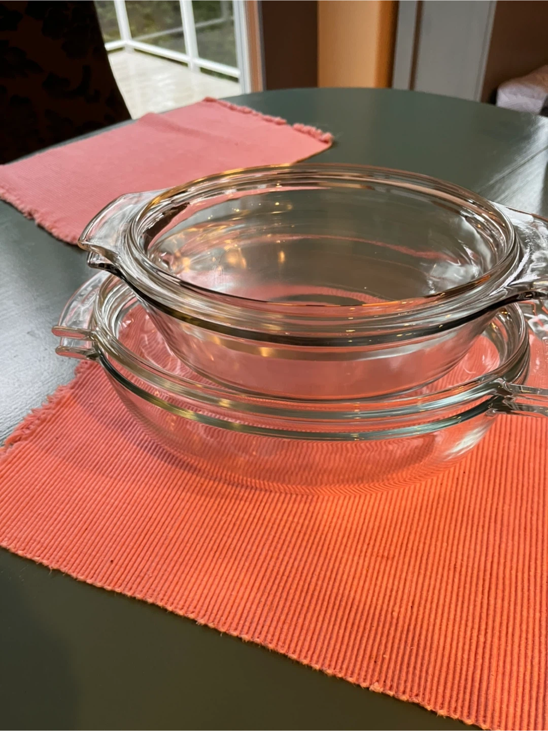 Selling a set of clear glass nesting bowls with lids. They are in great condition and perfect for storing leftovers or meal prepping! Pyrex one set made in France