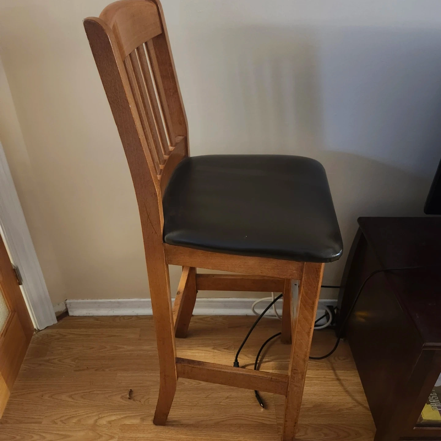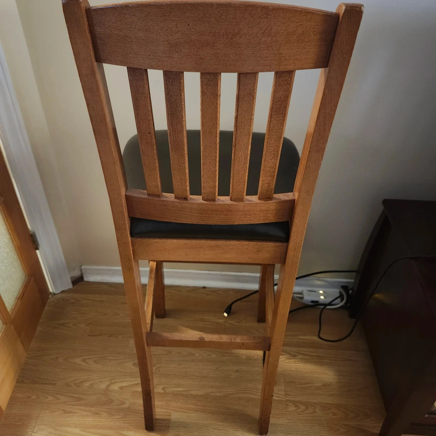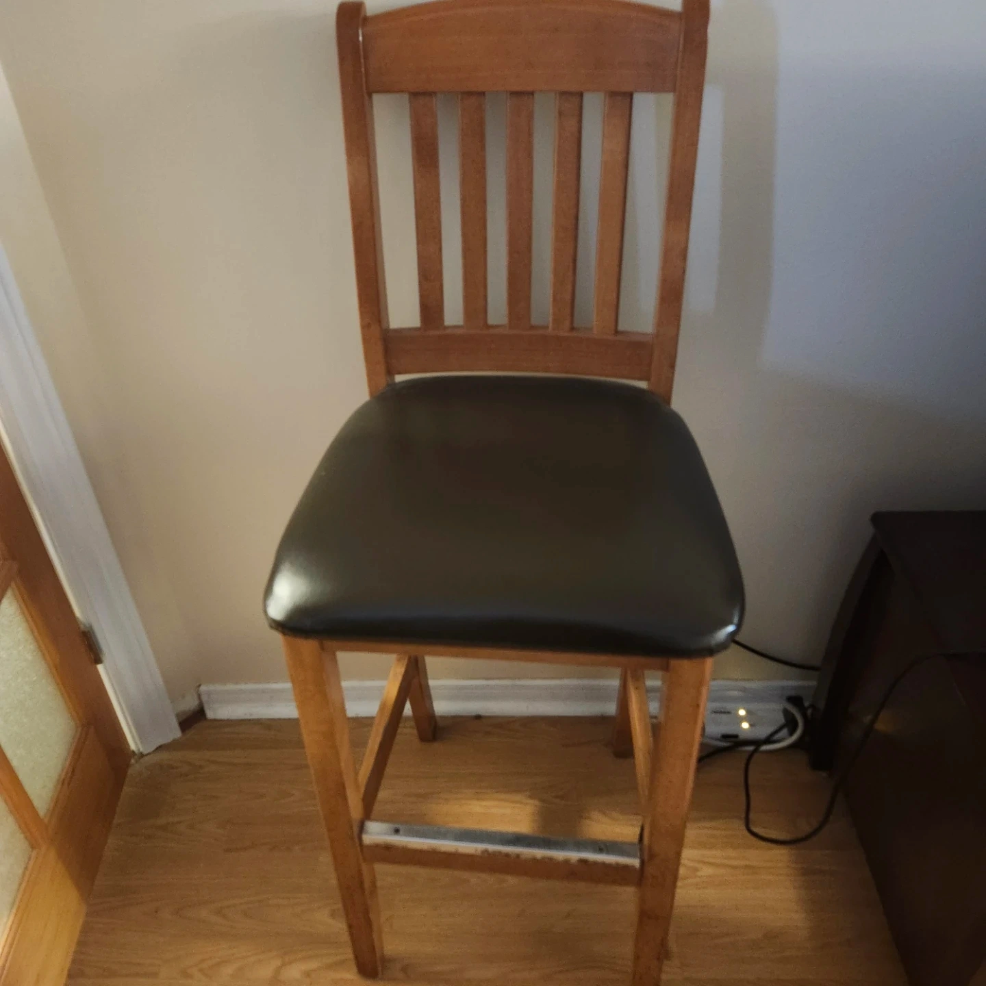 Selling a wooden bar stool with a brown seat. It's in good condition and would be a great addition to any kitchen or bar area. One of a kind.