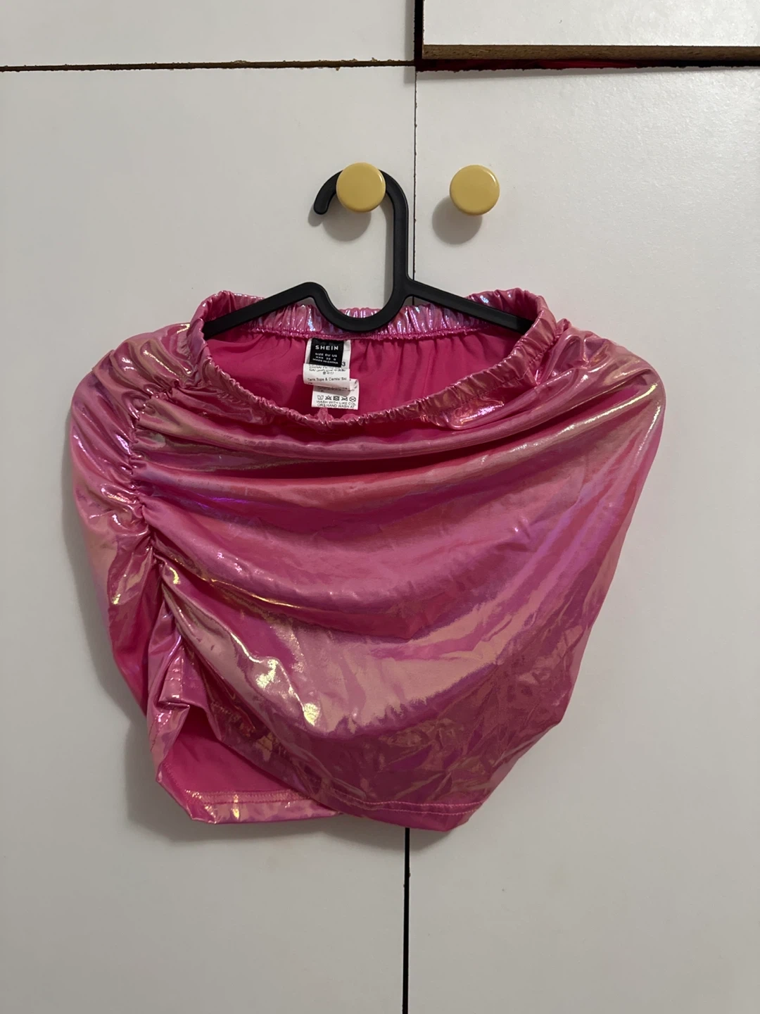 Selling a cute Shein pink holographic ruched mini skirt. Great for parties or concerts! It's in excellent condition and ready for a new owner.