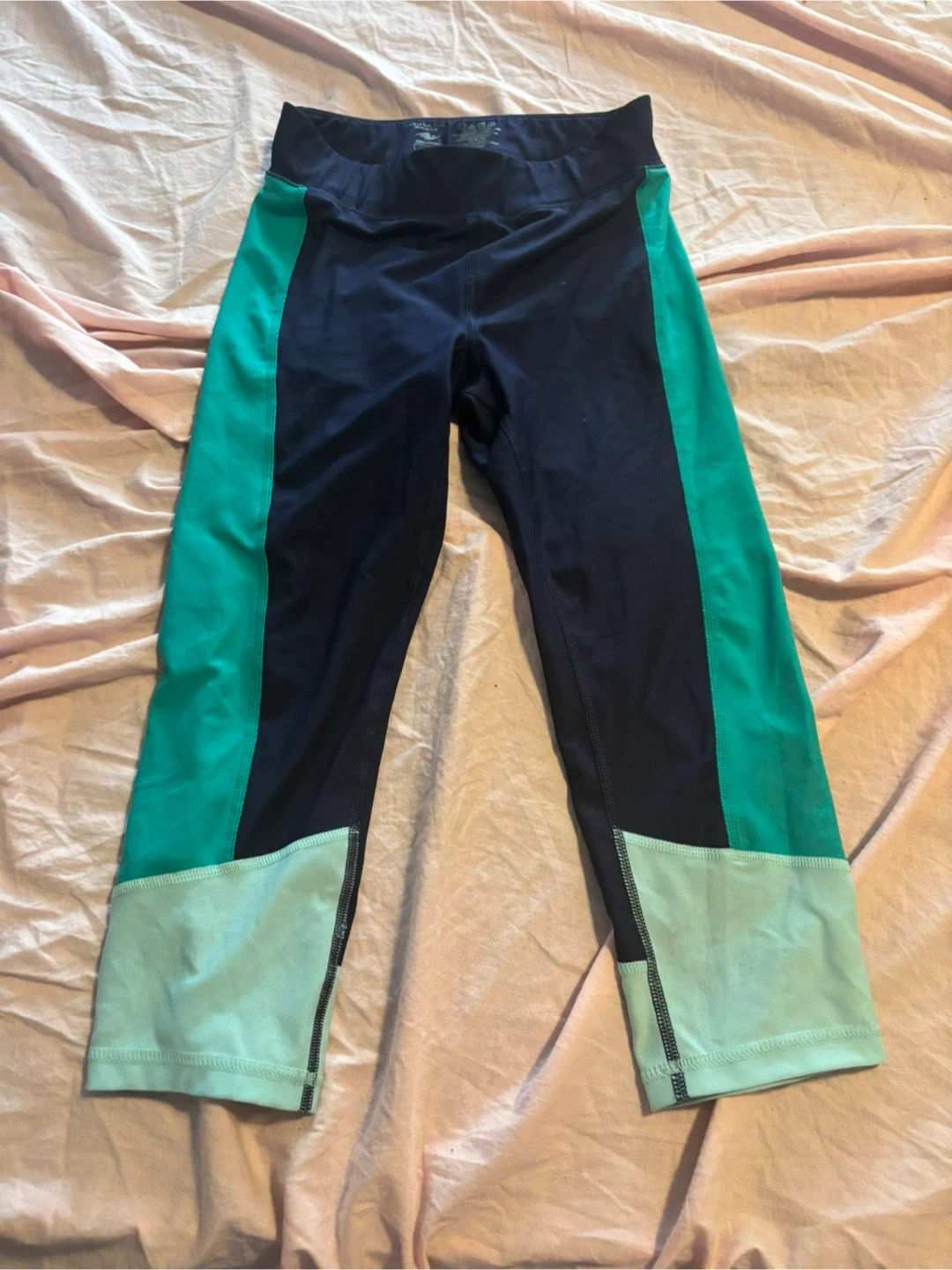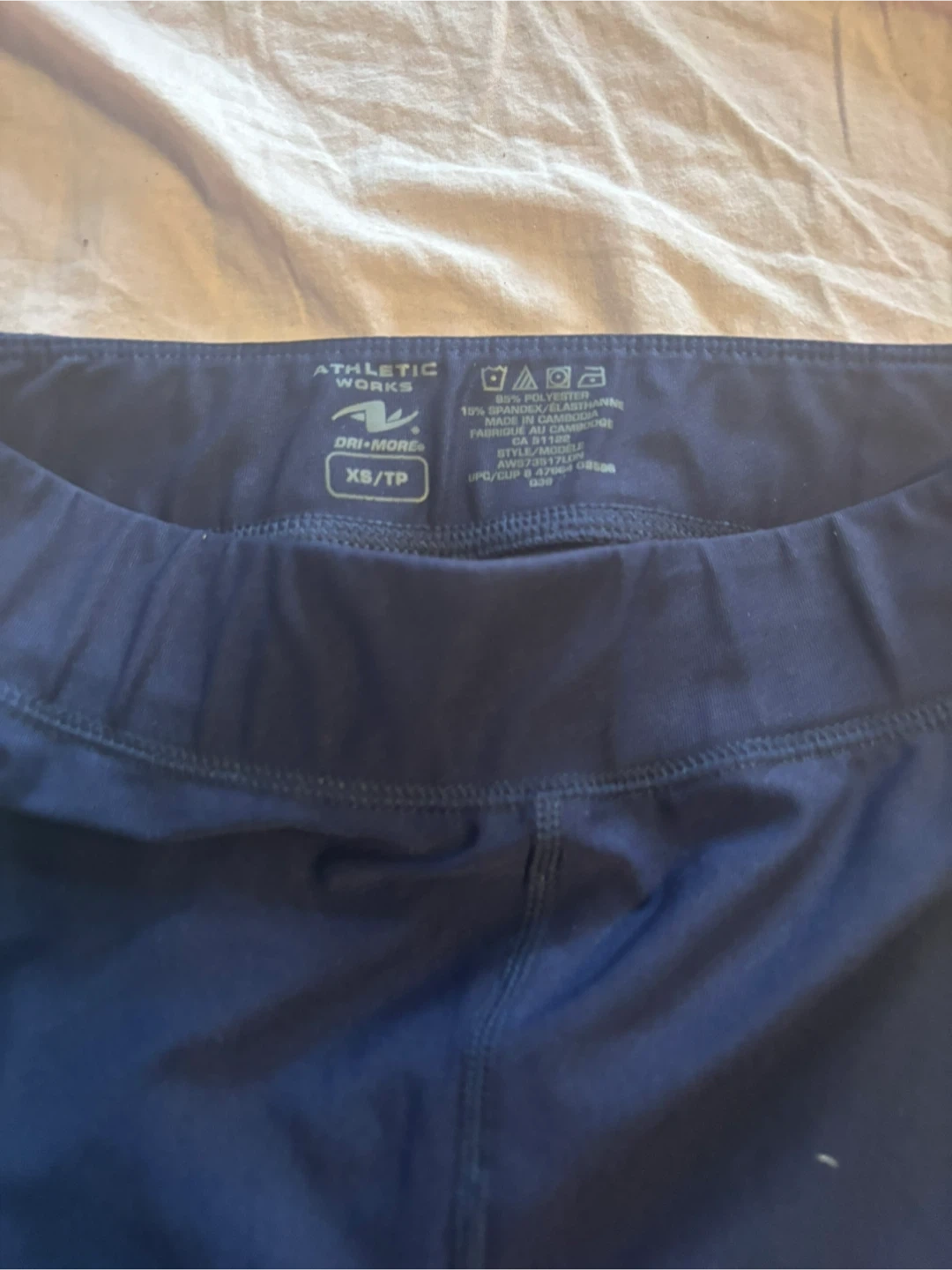 Selling a pair of Athletic Works leggings in size XS/TP. They're in great shape and have a stylish colour block design with navy and teal accents. Made with a comfortable blend of 90% polyester and 10% spandex!