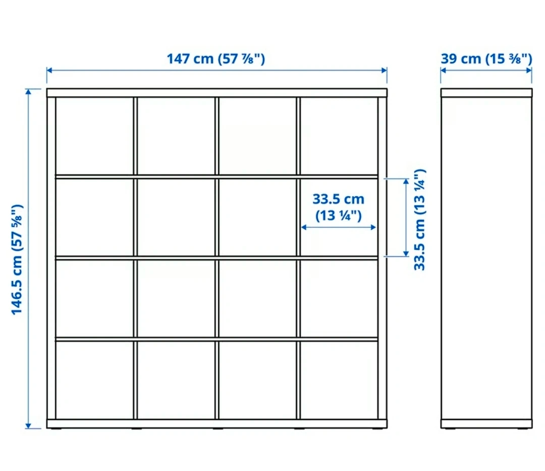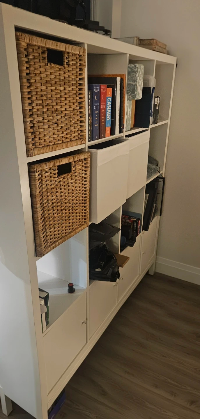Moving out sale of a white IKEA Kallax shelf unit with stand and doors. It's in great shape and ready to organize your space! The dimensions are approximately 147 cm (57 7/8") wide, 146.5 cm (57 5/8") high, and 39 cm (15 3/8") deep.