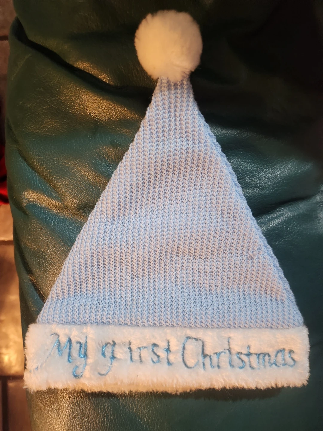 A sweet little light blue knit hat for baby's first Christmas! It has a soft, fluffy trim and a cute pompom on top. Perfect for holiday photos or keeping your little one cozy.