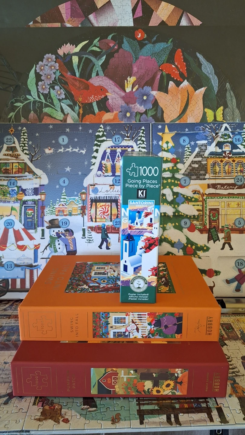 1000 piece puzzle by KI, featuring Santorini, Greece! It's from the 'Going Places Piece by Piece' collection. The box includes a poster to help you piece it together ,also with another 1000pcs puzzle