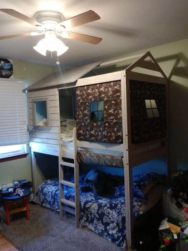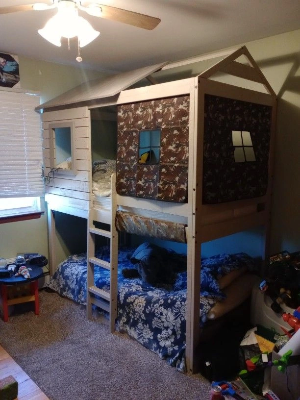 MATTRESSES NOT INCLUDED but product will be disassembled and boxed up with instructions included for you! Really cool house/fort design and several privacy curtains included (missing 1) comes from a smoke free- {cat friendly home, although the cat never went into this room} Originally paid $650 for it.