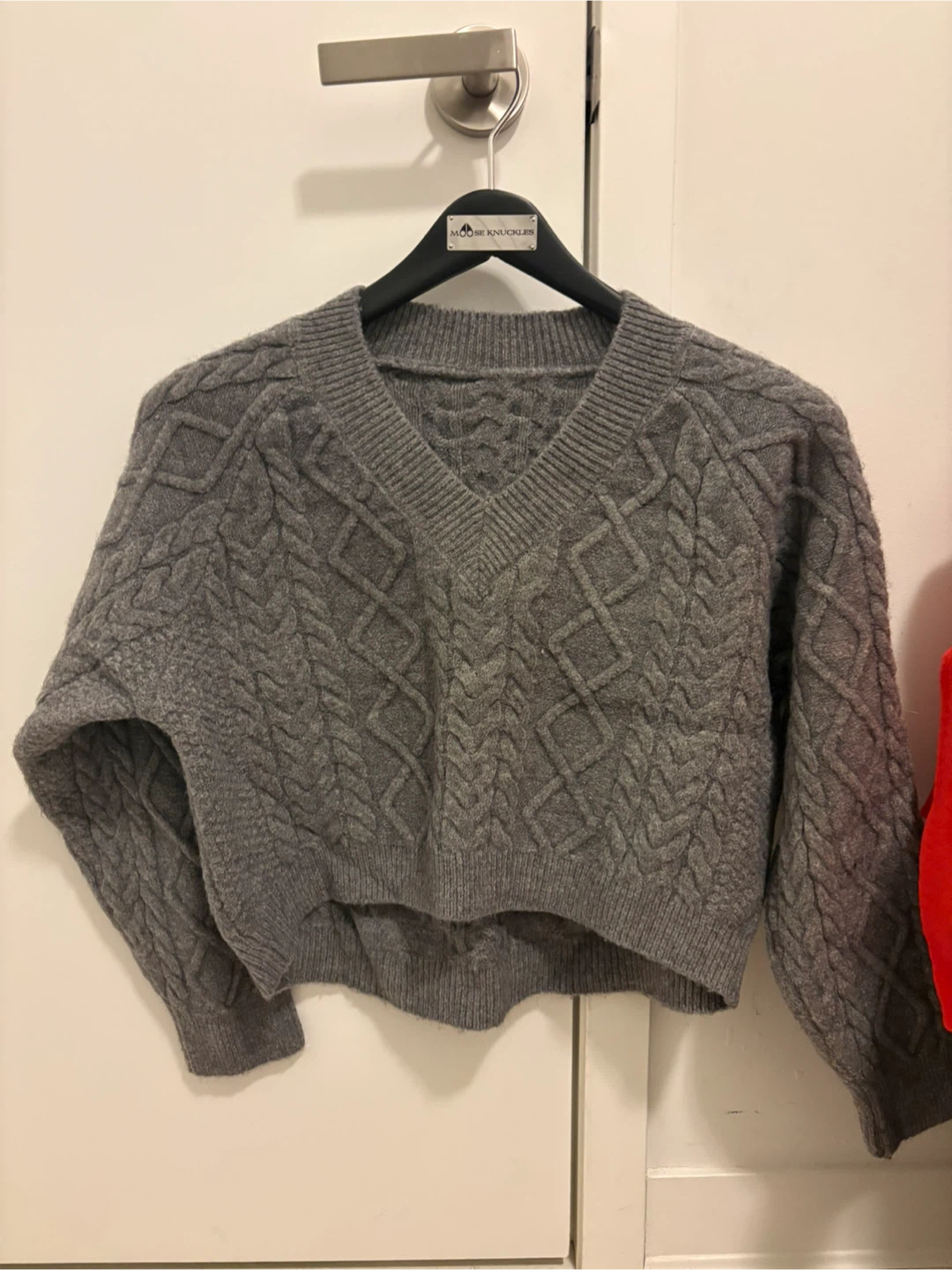 Cozy up in this stylish grey cable knit sweater! It's perfect for adding a touch of warmth and texture to your wardrobe. The V-neck design adds a flattering touch, making it a versatile piece for any occasion