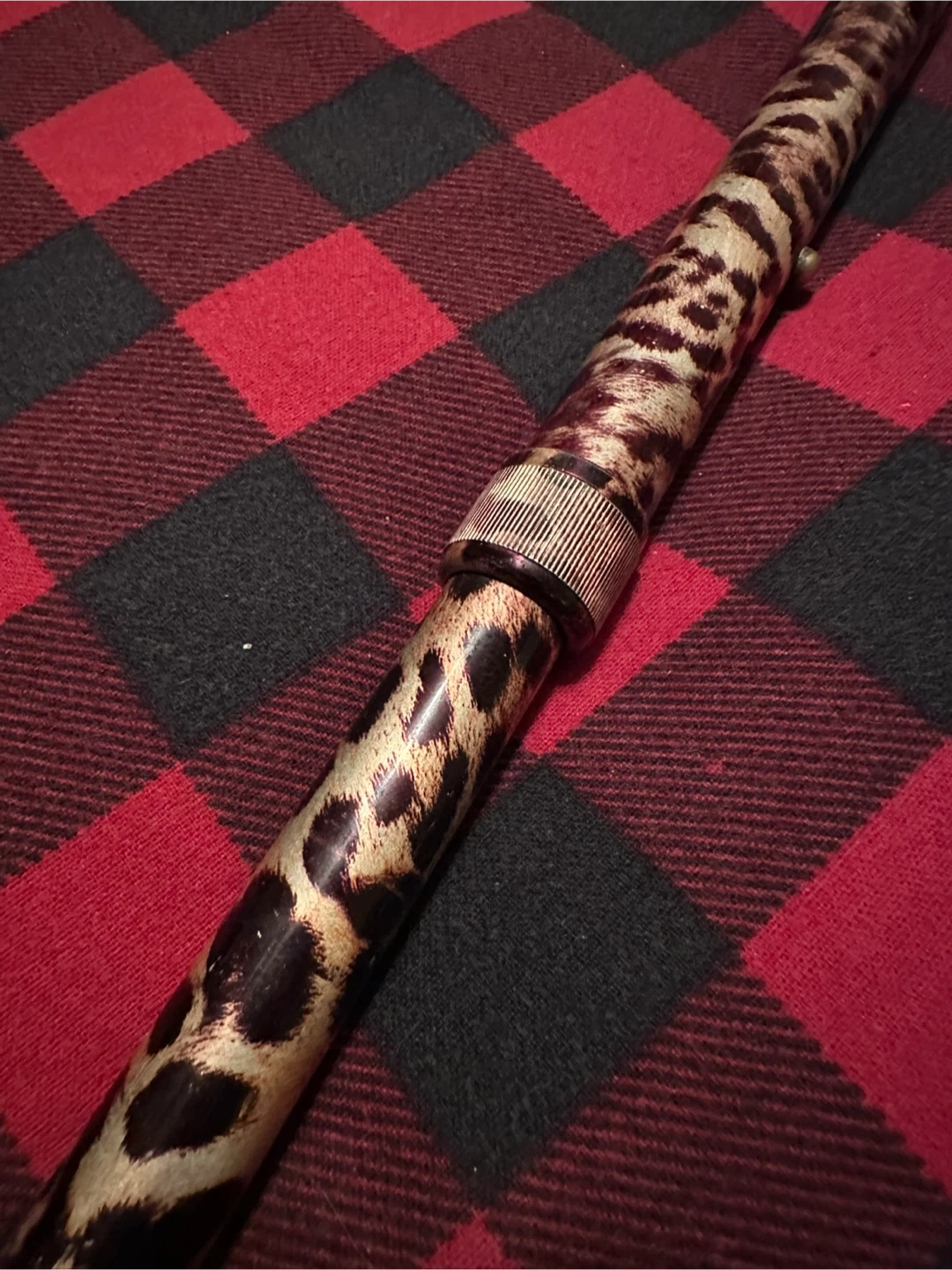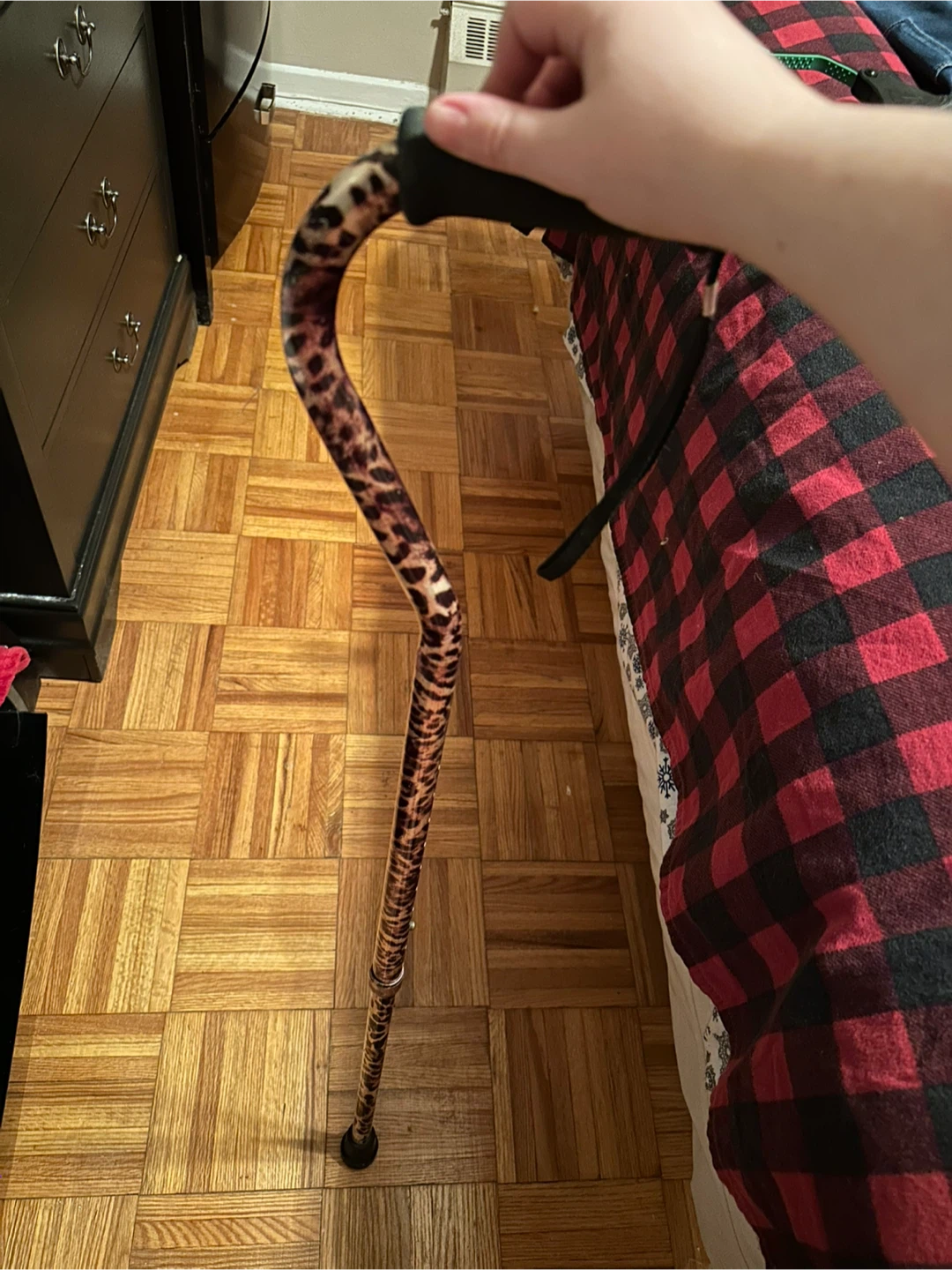 Leopard print cane perfect for true divas. It’s been used and has a small split in the handle foam, but is otherwise perfectly fine.