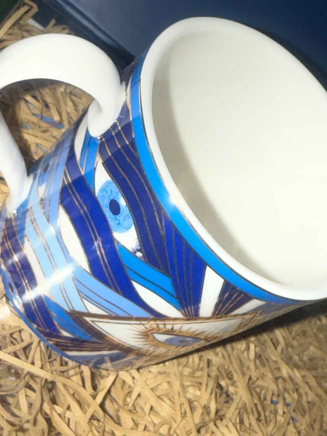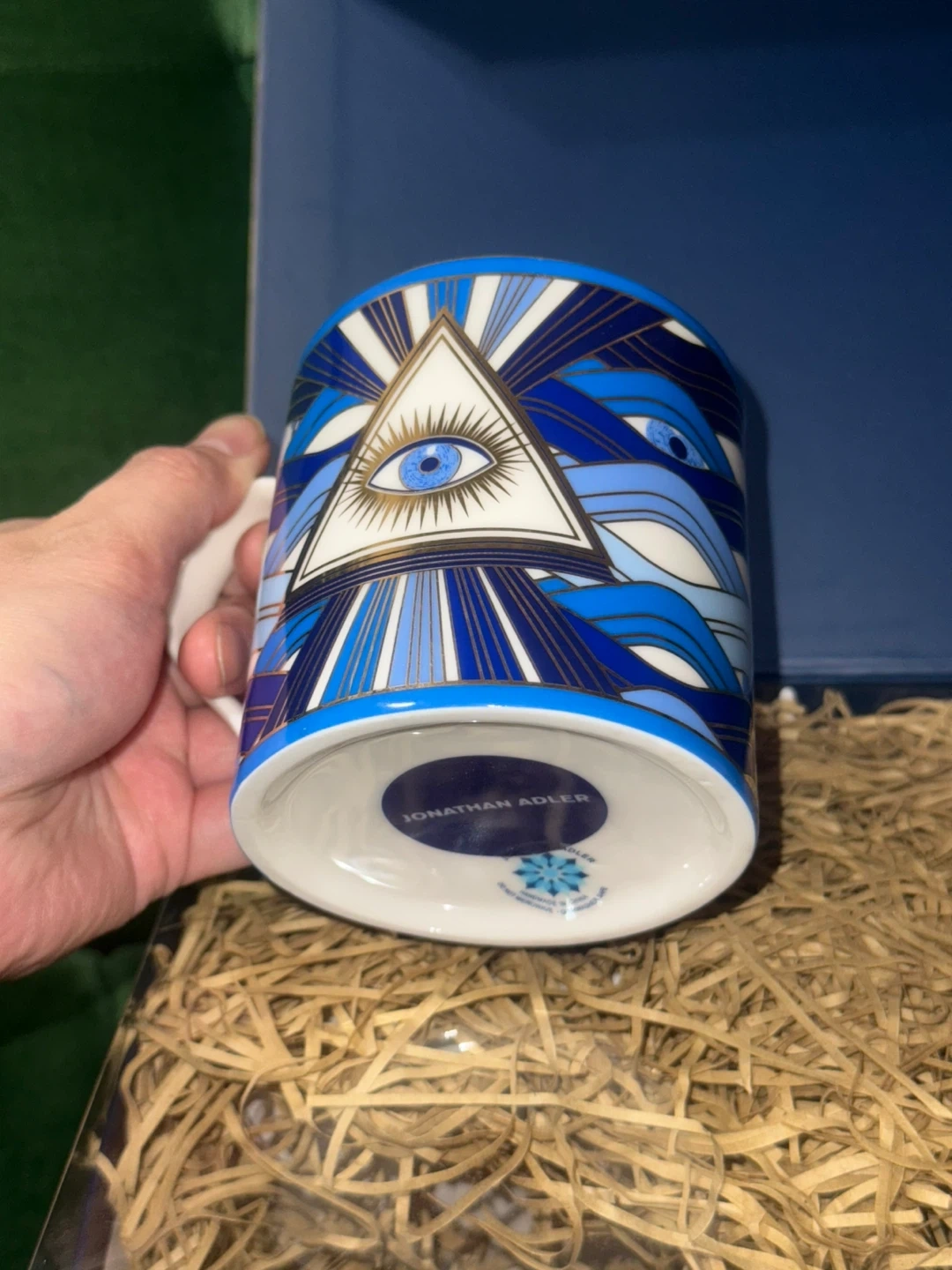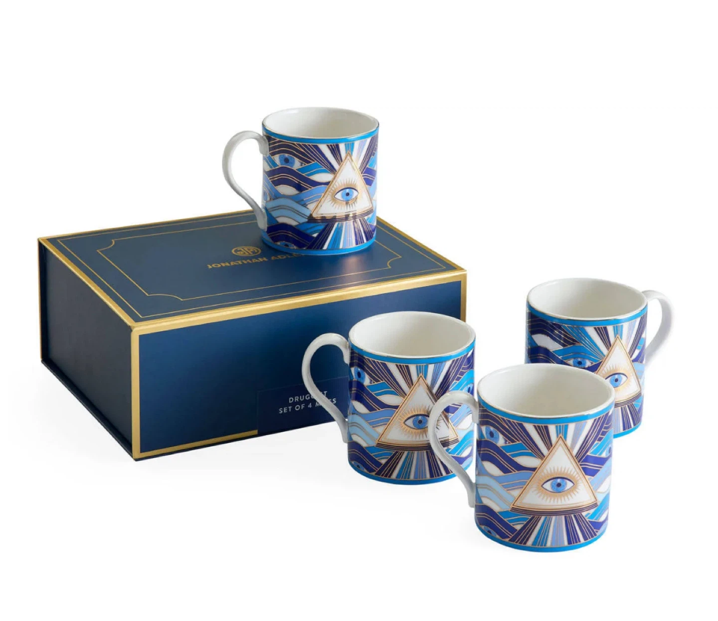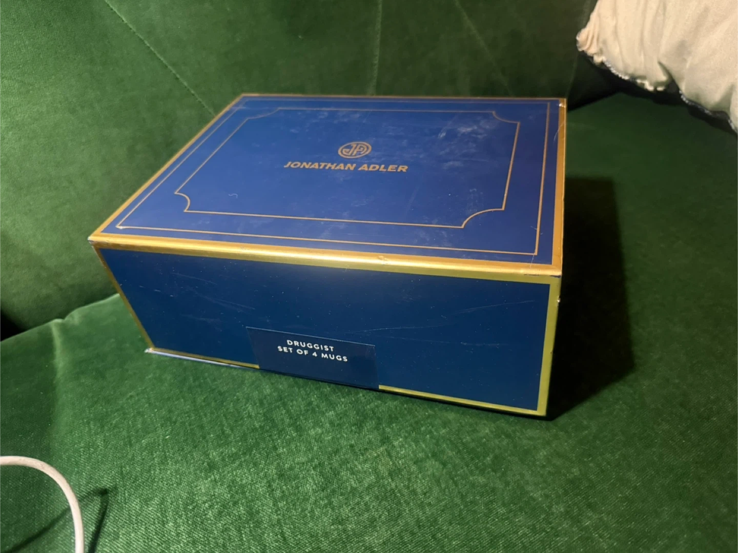 Brand new, Jonathan Adler Druggist Mug. blue/multicolour porcelain all-over graphic print glossy finish glazed interior dishwasher safe 12 fl oz. $30 for one, $50 for 2, $75 for 3, $90 for whole set of 4 with original box.