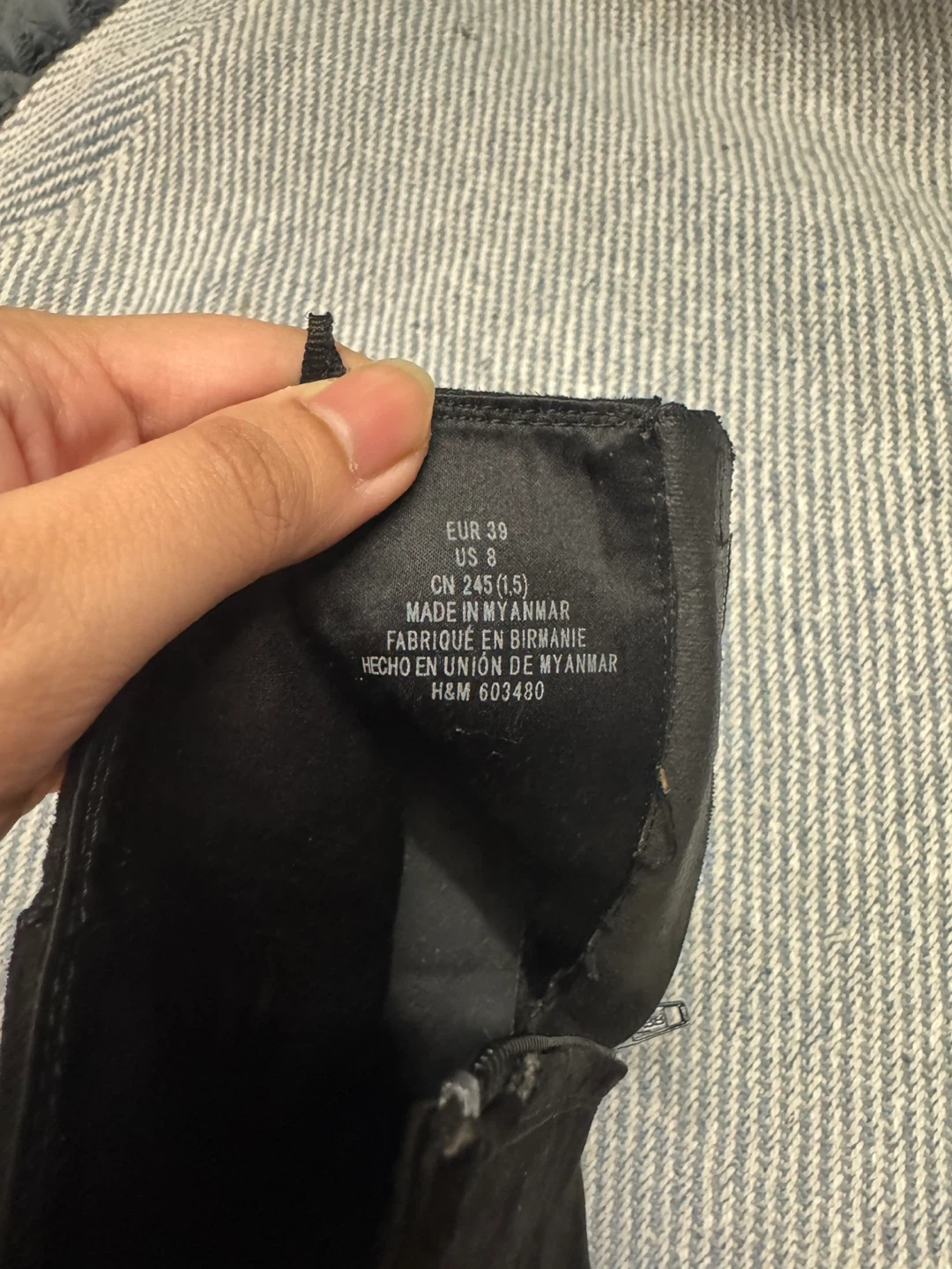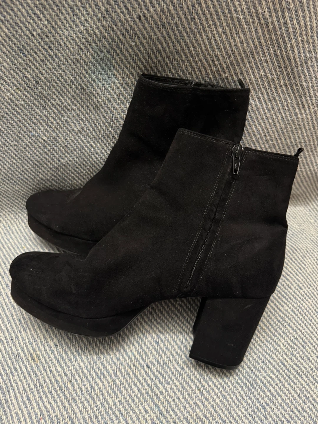 Selling a pair of H&M black ankle boots in US size 8. These boots feature a side zipper and a chunky heel. They are made of a suede-like material. The boots are clean with no damage.