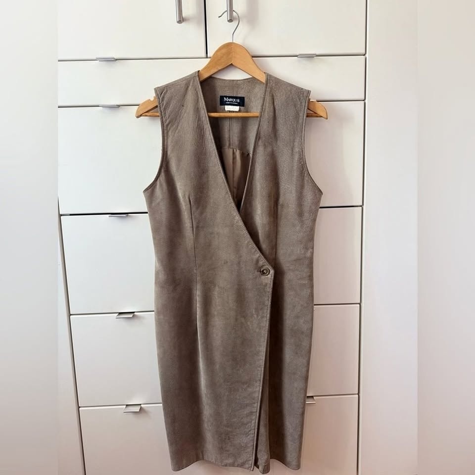 Absolutely stunning and timeless, this vintage Marquis dress is crafted from 100% leather in a gorgeous taupe color. It features a unique closure with one inside clip and a button overlay, making it both stylish and functional.