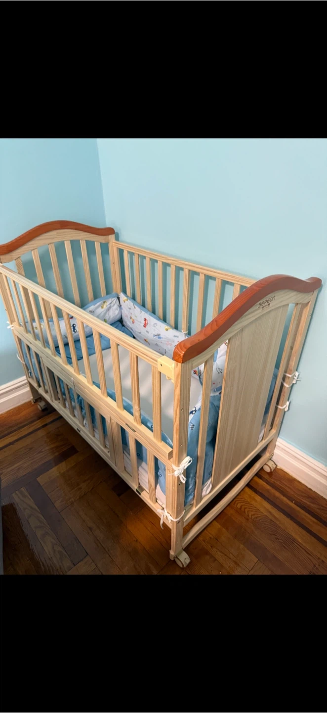 Selling a gently used wooden baby crib. Baby slept in it maybe 4 times. It comes with the bedding shown in the pictures. The side opens so you can easily take your baby out of the crib. It’s impossible to find one of these. Original price $400. Perfect for your little one's nursery!