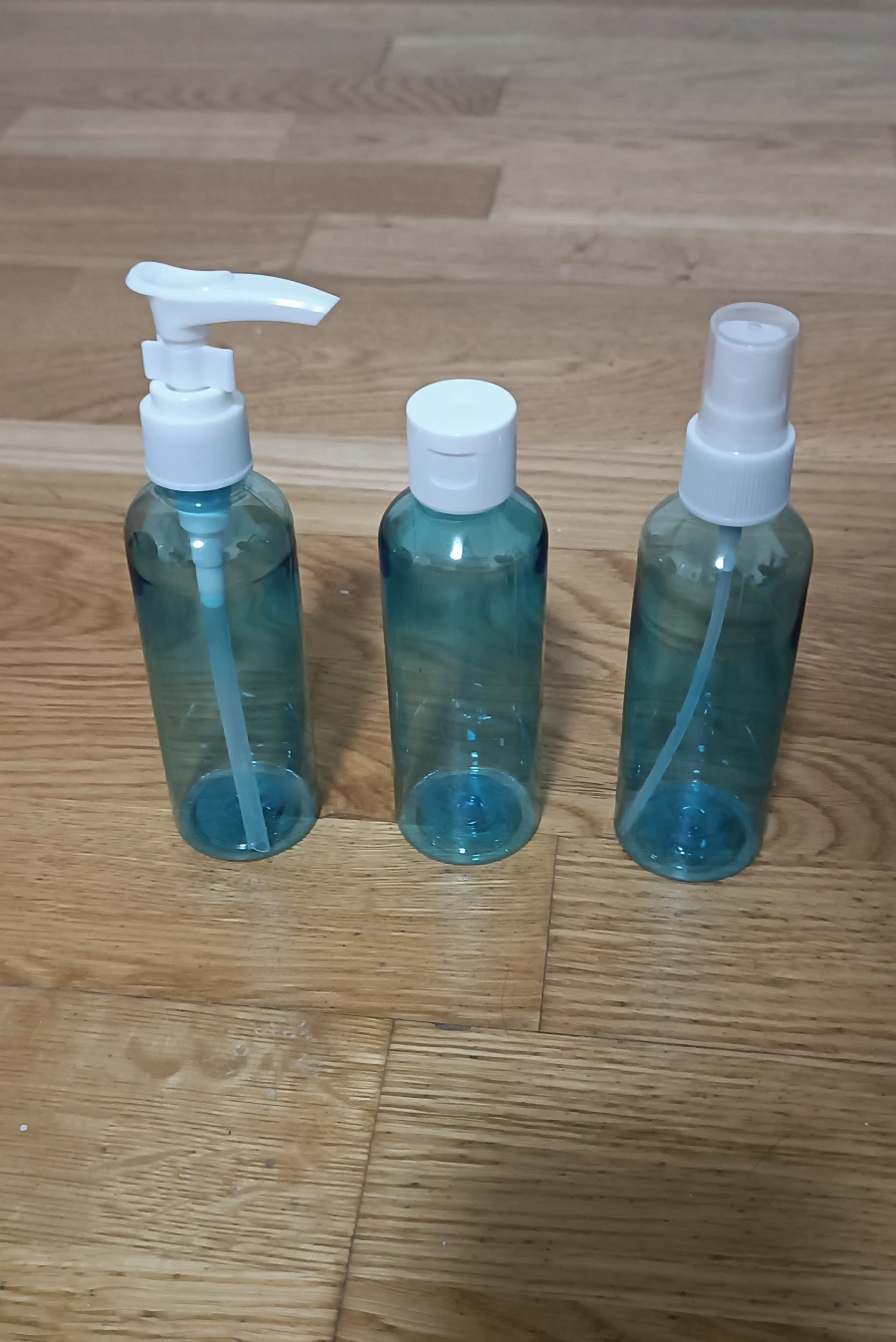 Selling a set of 3 new blue travel bottles of 100ml each. There's a pump bottle, a regular bottle with a cap, and a spray bottle. Perfect for storing your lotions, sanitizers, or other liquids for travel!