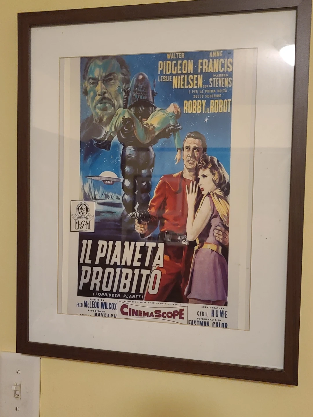 Selling a framed movie poster for "Forbidden Planet" (Il Pianeta Proibito). It features Walter Pidgeon, Anne Francis, and Leslie Nielsen. The poster is in a solid frame and would look great in any movie lover's home!