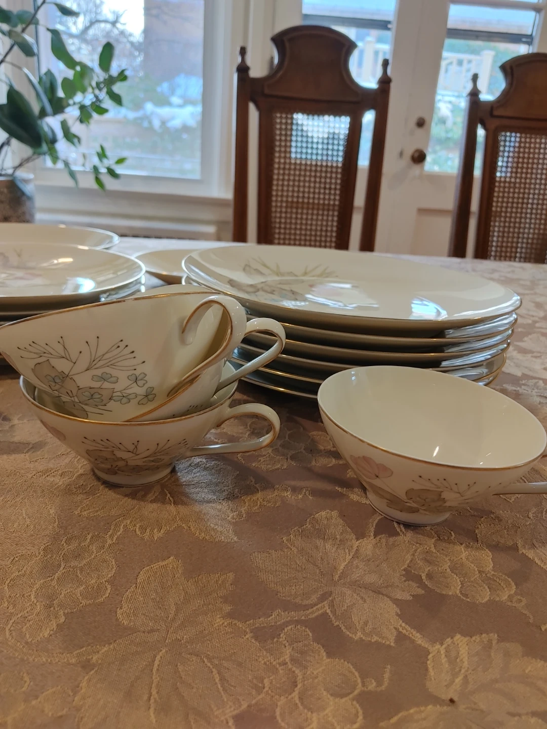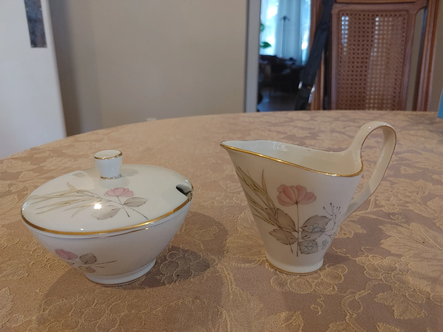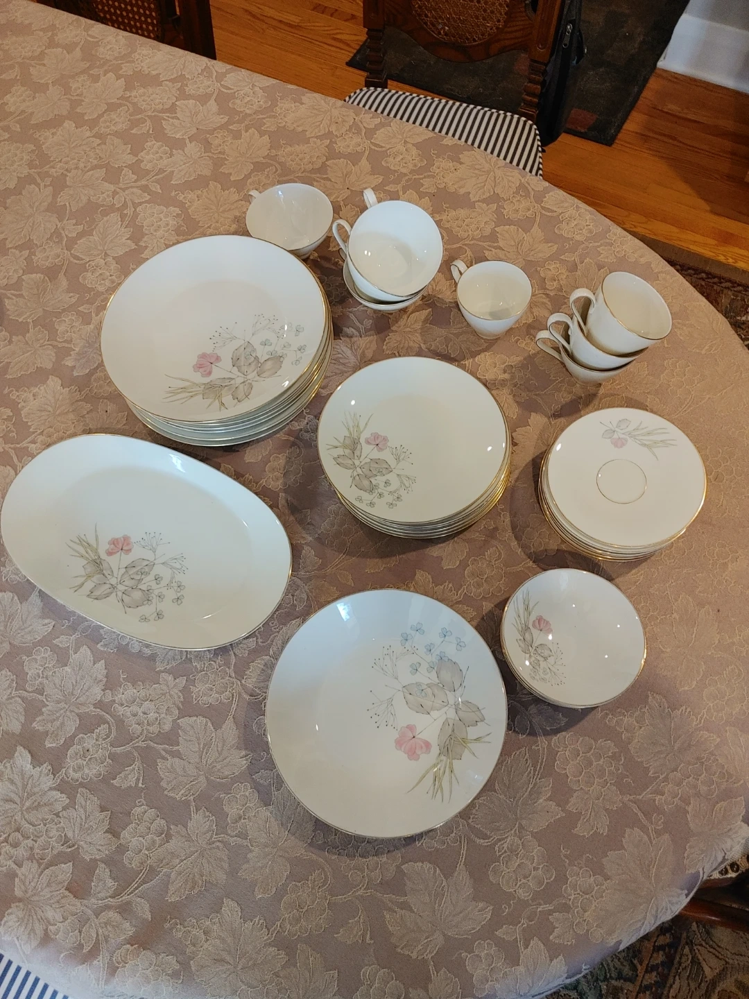 Selling a vintage fine china set featuring a delicate floral design. This set includes plates, bowls, cups, saucers, a creamer, and a sugar bowl. Perfect for adding a touch of elegance to your dining experience!
