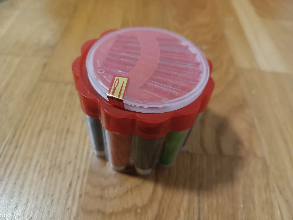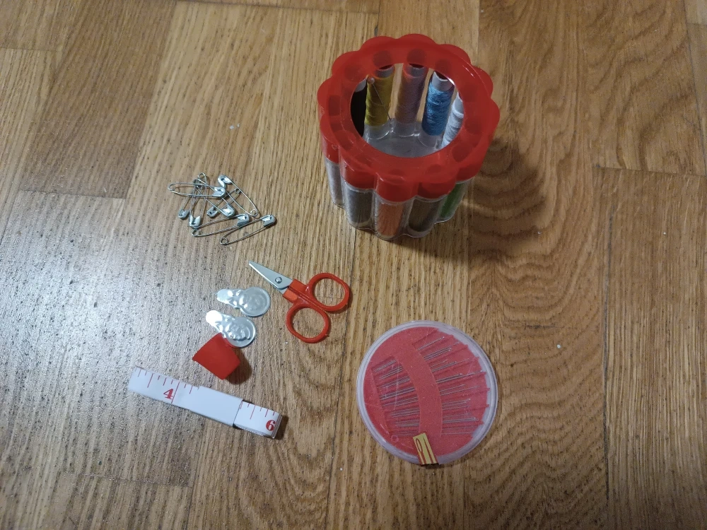 I'm selling a complete sewing kit that includes various colours of thread, needles, safety pins, a small pair of scissors, and a measuring tape. It's perfect for sewing projects or repairs!