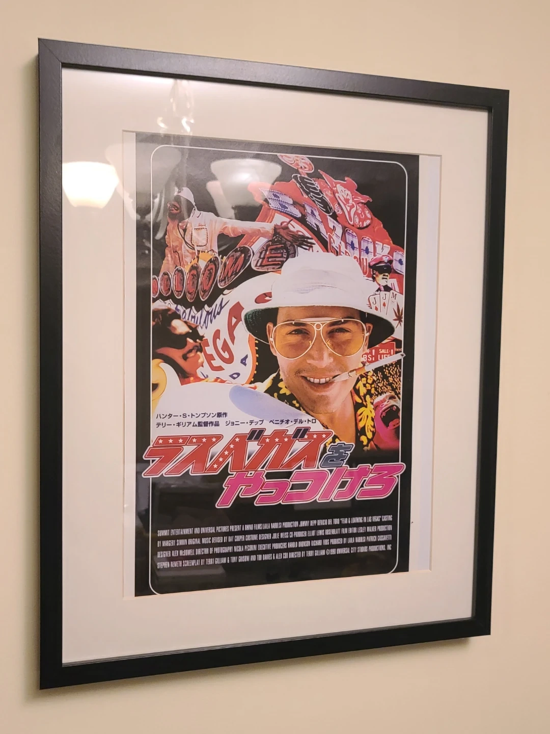 Framed Thai poster of the movie "Fear and Loathing in Las Vegas" starring Johnny Depp and Benicio Del Toro, directed by Terry Gilliam. A great addition for movie buffs or anyone who loves a bit of counter-culture art