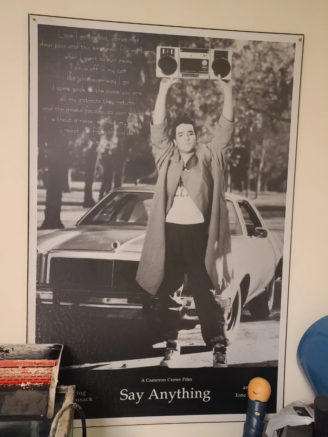 Selling a large poster for the movie "Say Anything". It's a Cameron Crowe film featuring John Cusack. The poster features a black and white image from the movie with some of the film's dialogue printed on it. Wood mounted, large print. Formerly hung on a restaurant wall. It's a great piece for any movie lover!