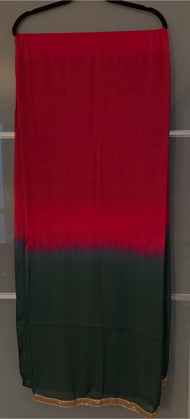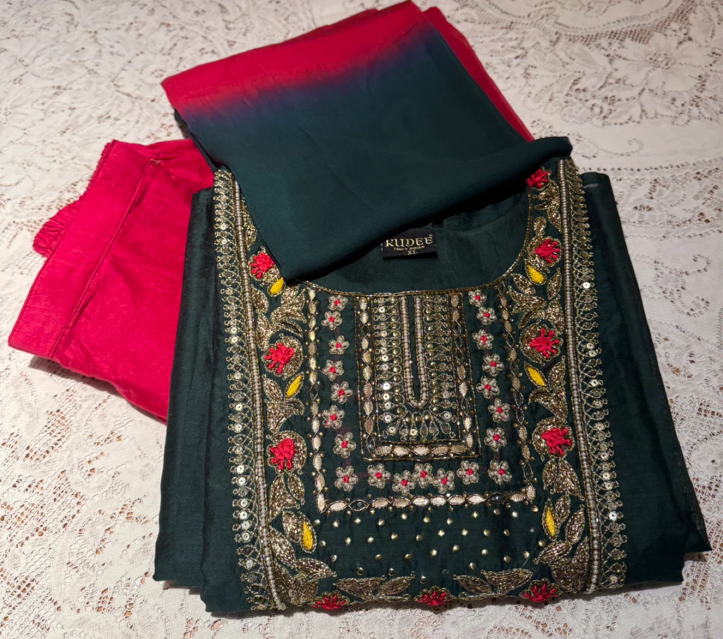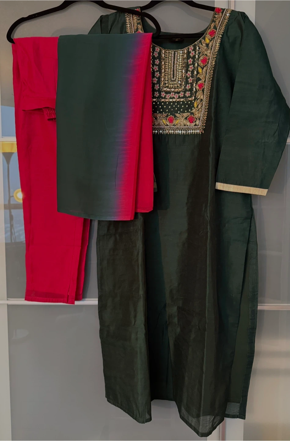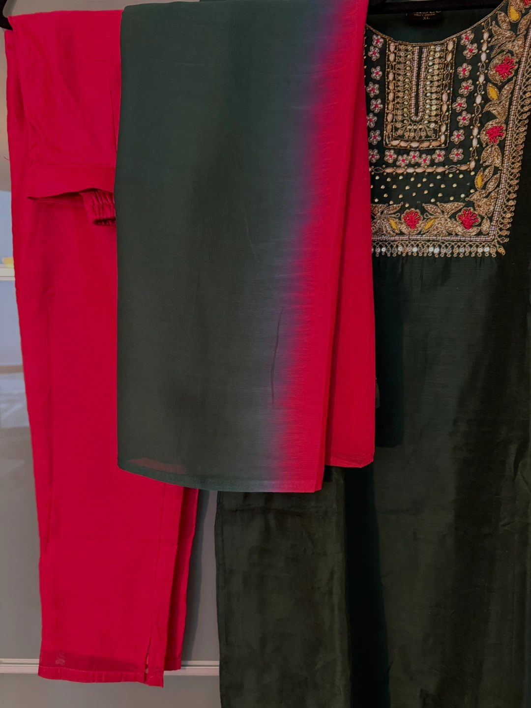 **SCARF: Beautiful dual-tone scarf (dupatta), blending both top and bottom colors of the bottle green and pink colours of the outfit!