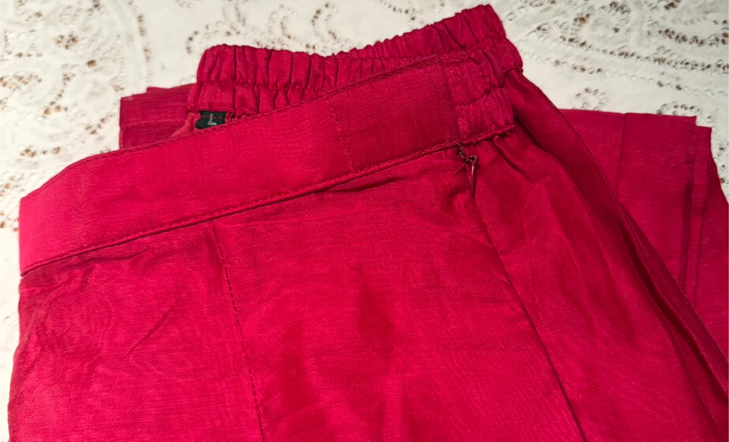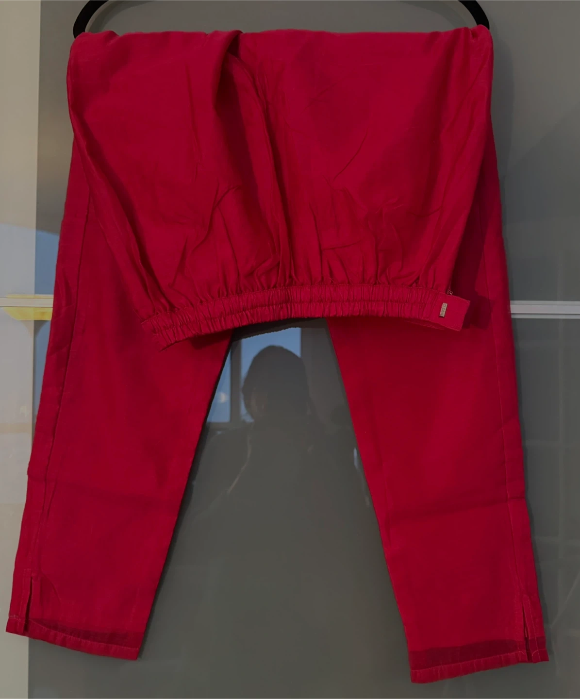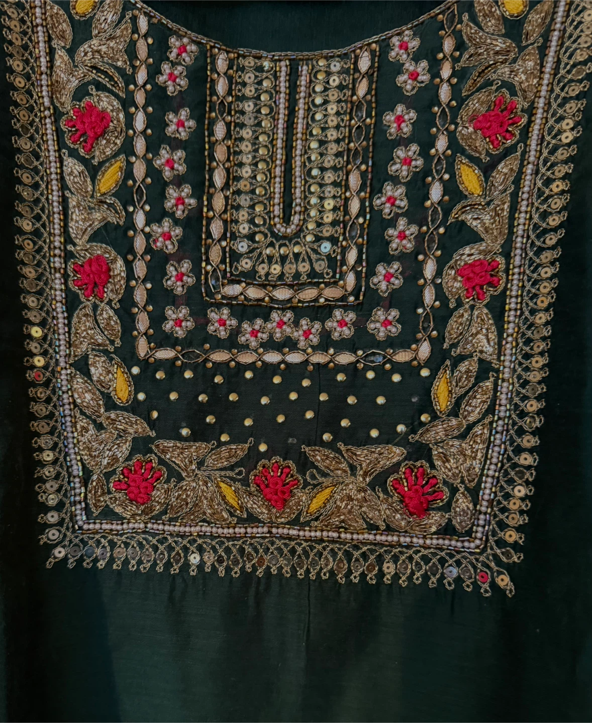 • Color Palette: A sophisticated Bottle Green top paired with Rich Pink bottoms and a scarf that is a blend of both the beautiful colours of the outfit giving it a regal look!!