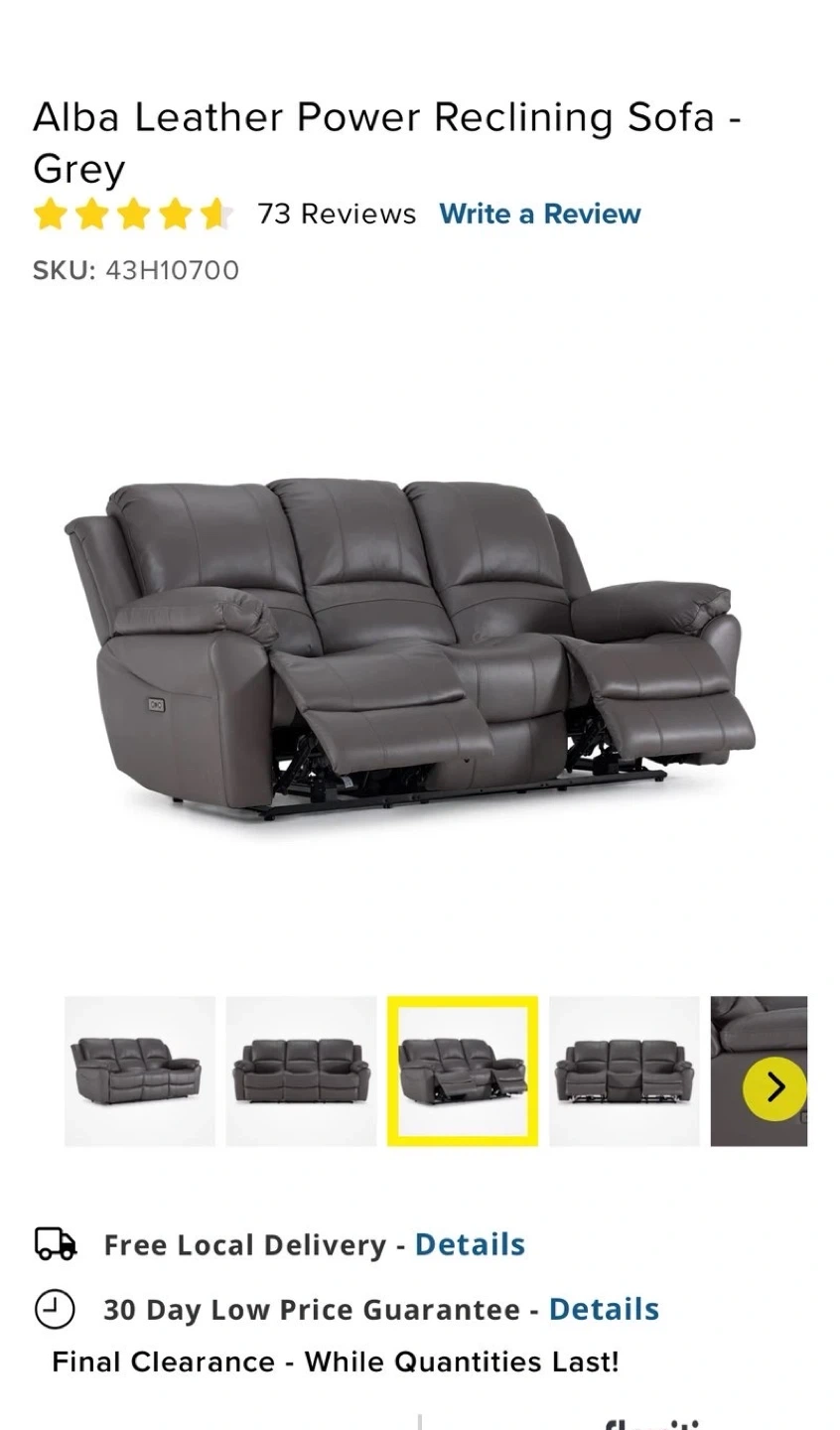 Selling a grey Alba Leather Power Reclining Sofa! It's a comfy and stylish addition to any living room. The power reclining feature makes it perfect for relaxing after a long day. It's in great condition and ready for a new home!