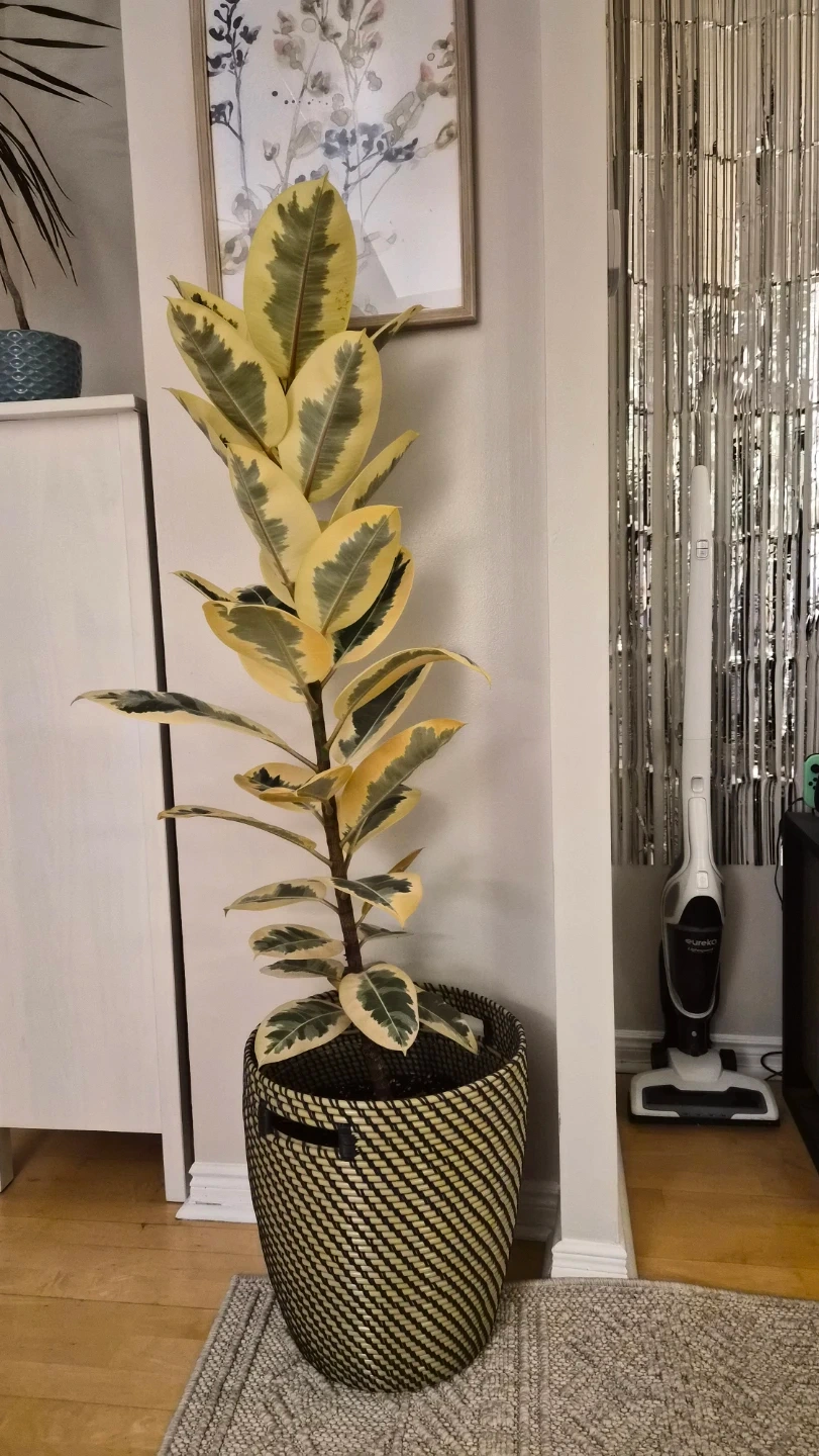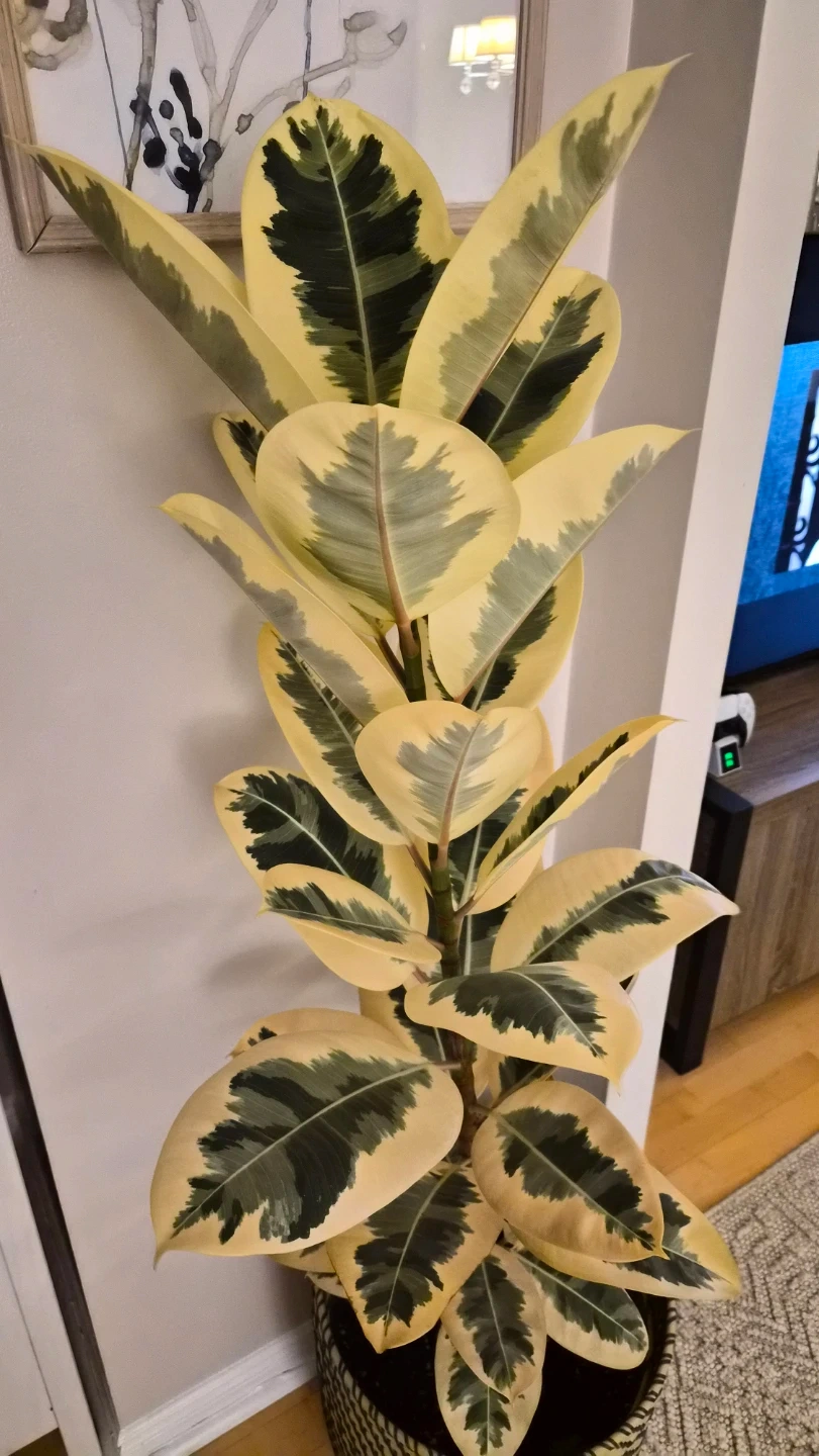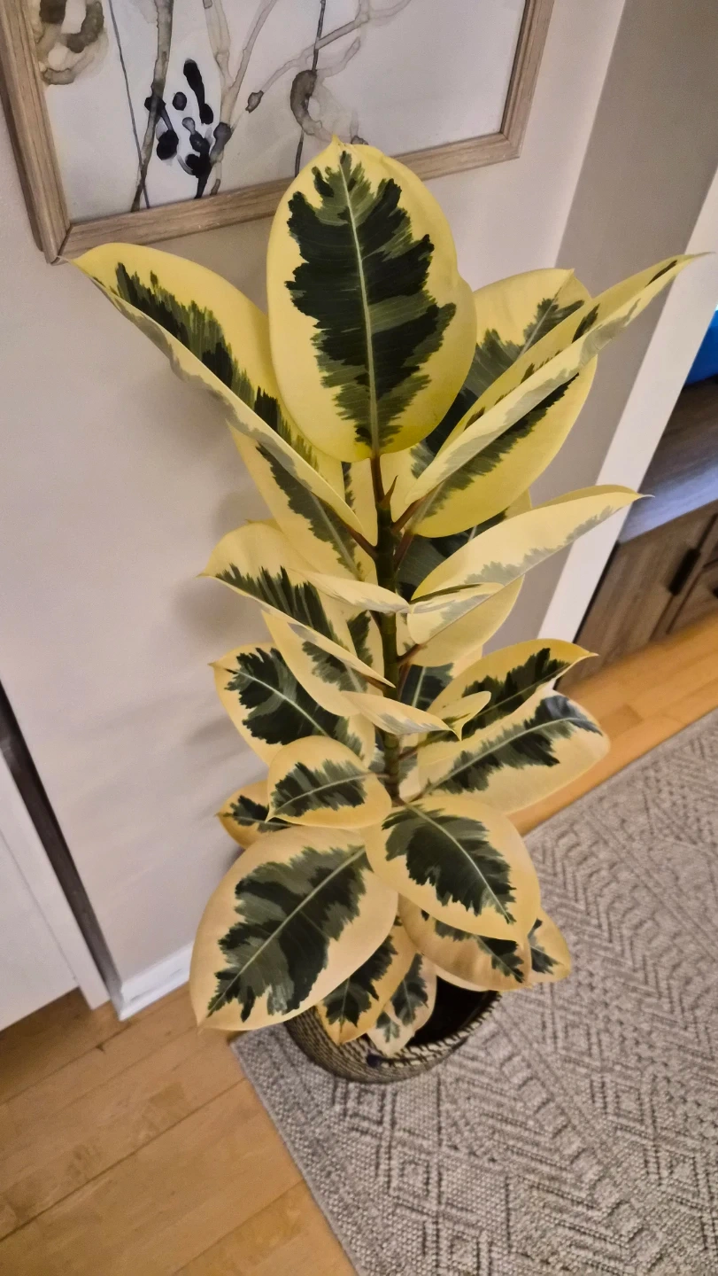 Selling a beautiful Ficus Elastica Variegata plant! It stands approximately 5 feet tall and would make a great addition to any room. The leaves have a lovely variegated pattern with shades of green and cream.