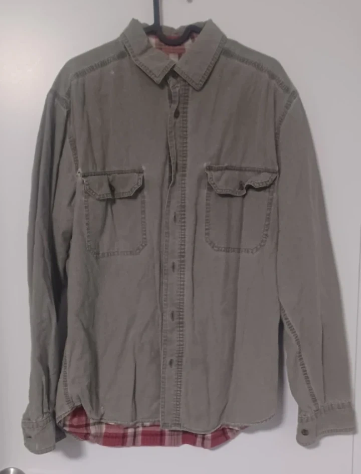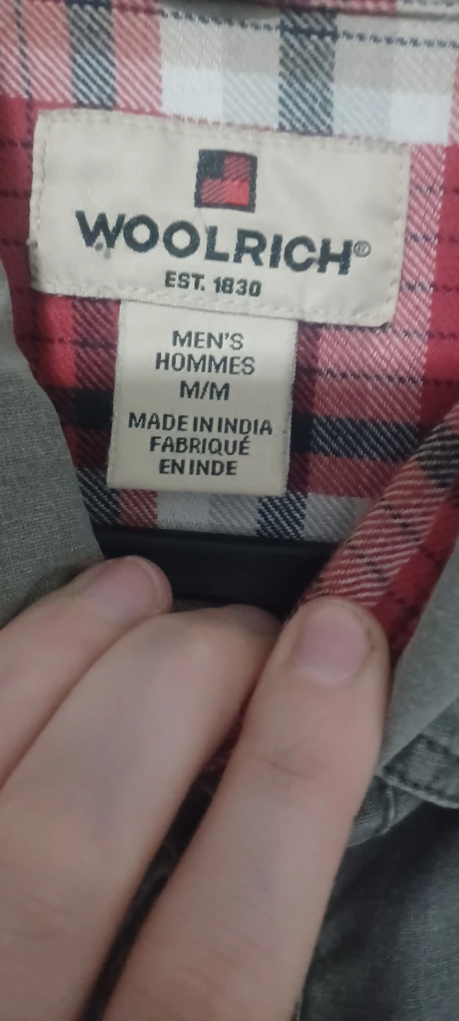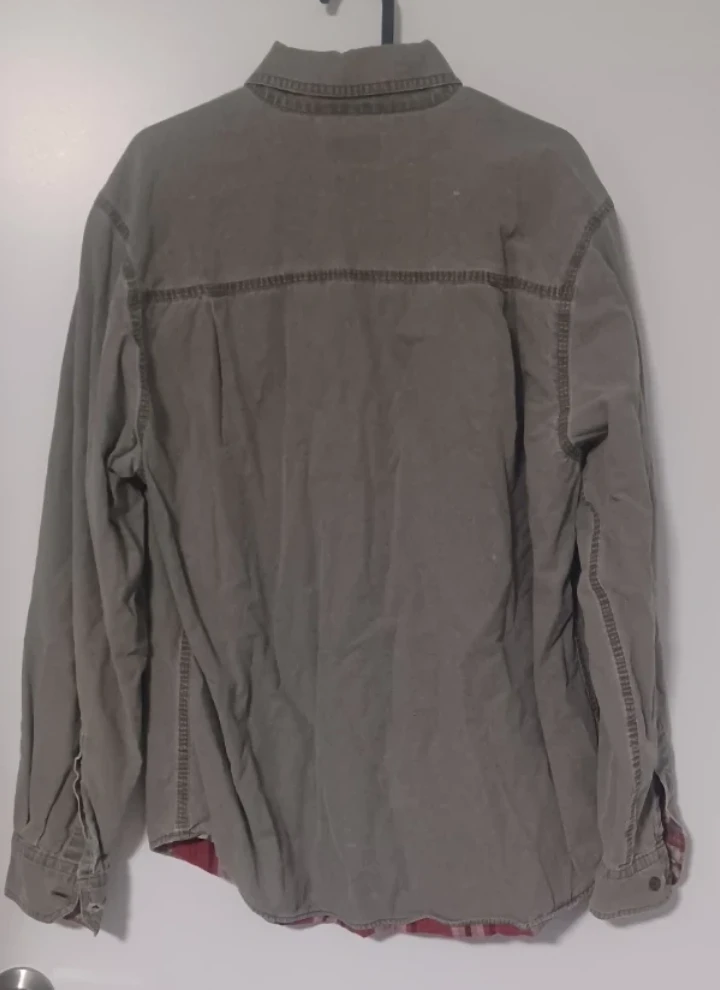 Here's a Woolrich men's shirt in size M! It features a classic design with a red and black plaid pattern on the inside. The outer material is a solid colour, giving it a versatile look. Perfect for casual wear or layering!