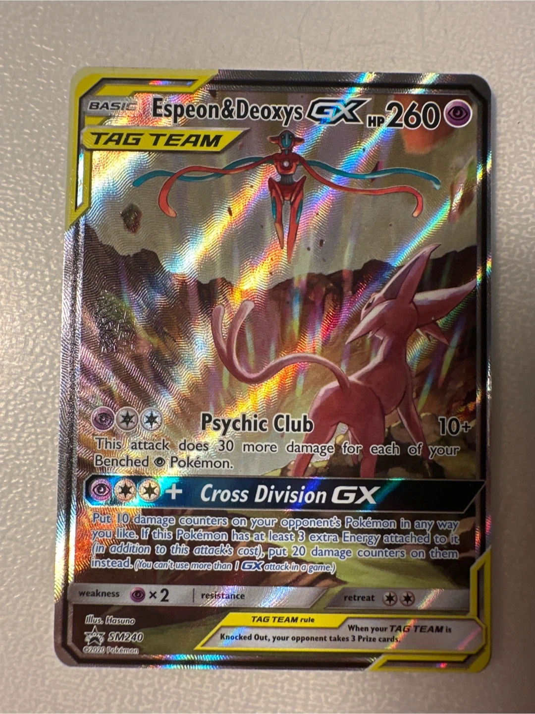 Selling an Espeon & Deoxys GX Tag Team Pokémon card! This card has a Psychic Club attack and a Cross Division GX attack. It's from the SM240 series and illustrated by Hasuno. A great addition to any collection!