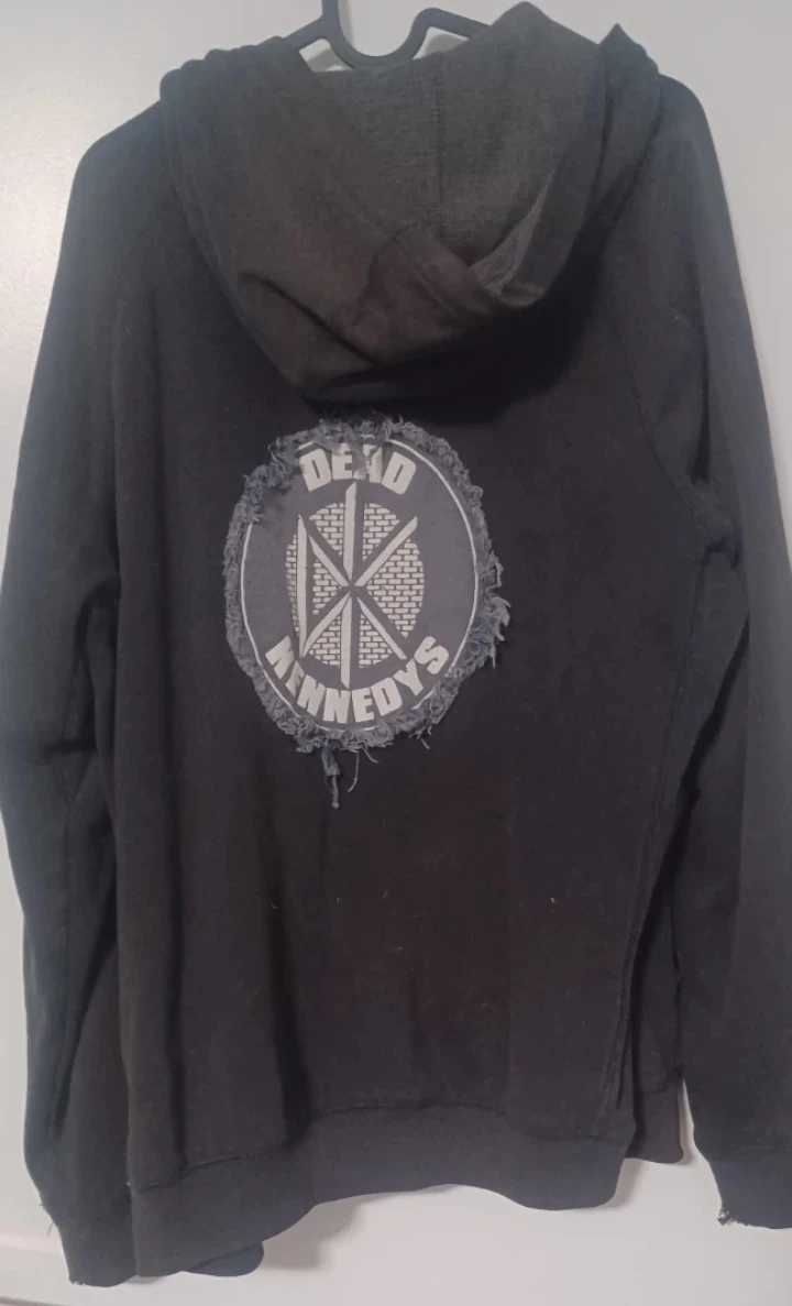 Mens hoodie with added Dead Kennedys back patch. Some natural punk wear but it's in good condition and ready for a new owner! The hoodie features a zipper closure and a hood for added warmth and style.