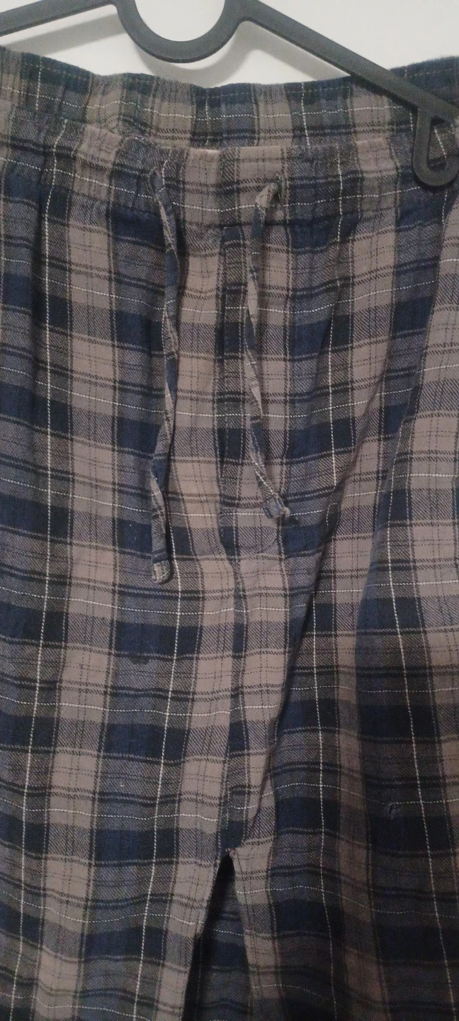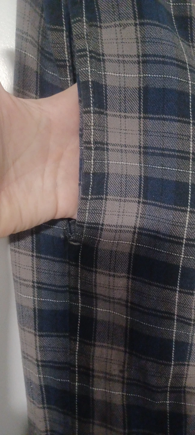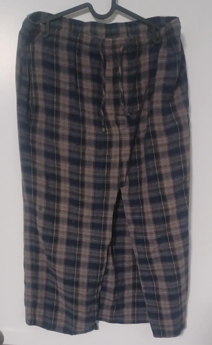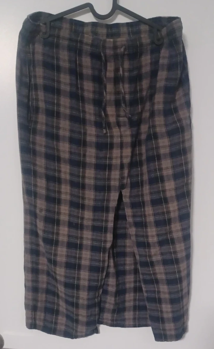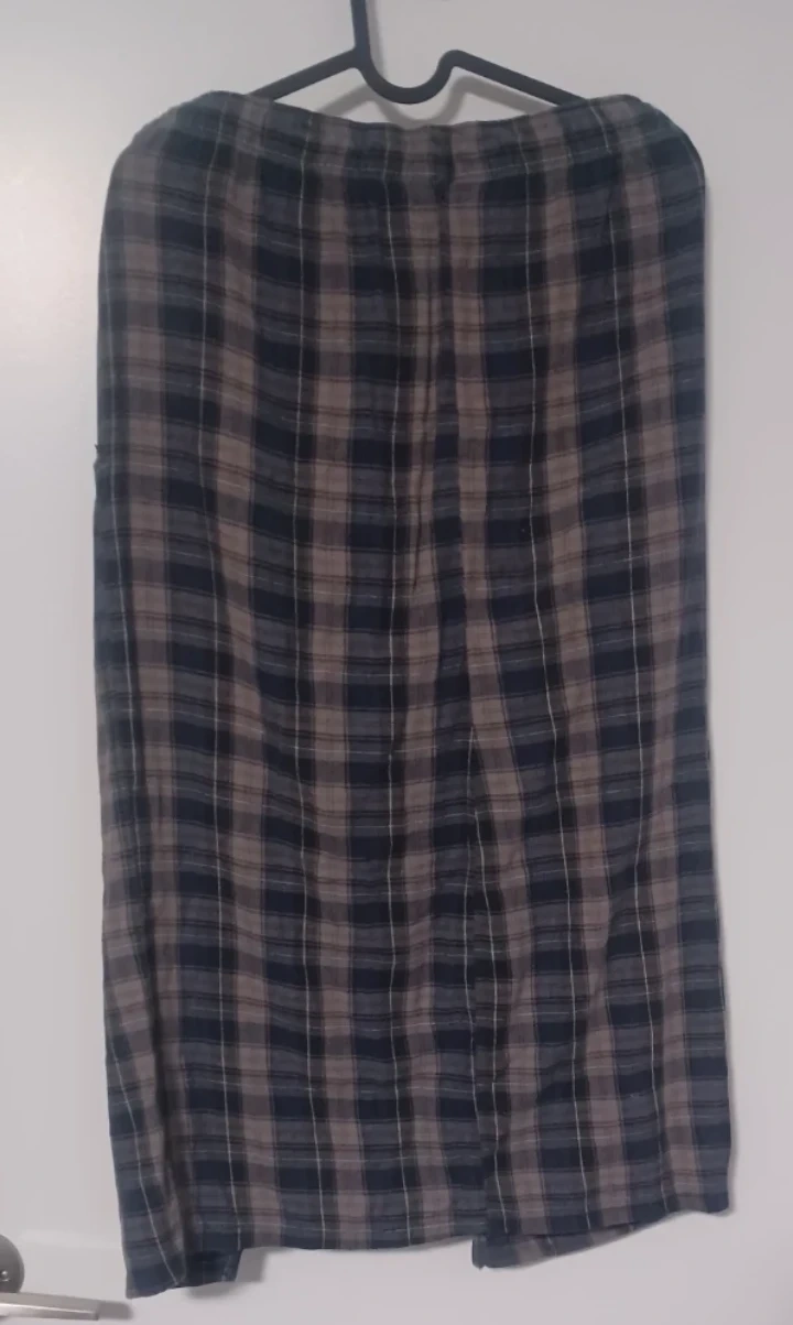 Here's a plaid skirt in a mix of blue and grey colours. It features a drawstring and a slit at the front. Rad-cycled from men's pj's so it has pockets! Perfect for casual wear :)