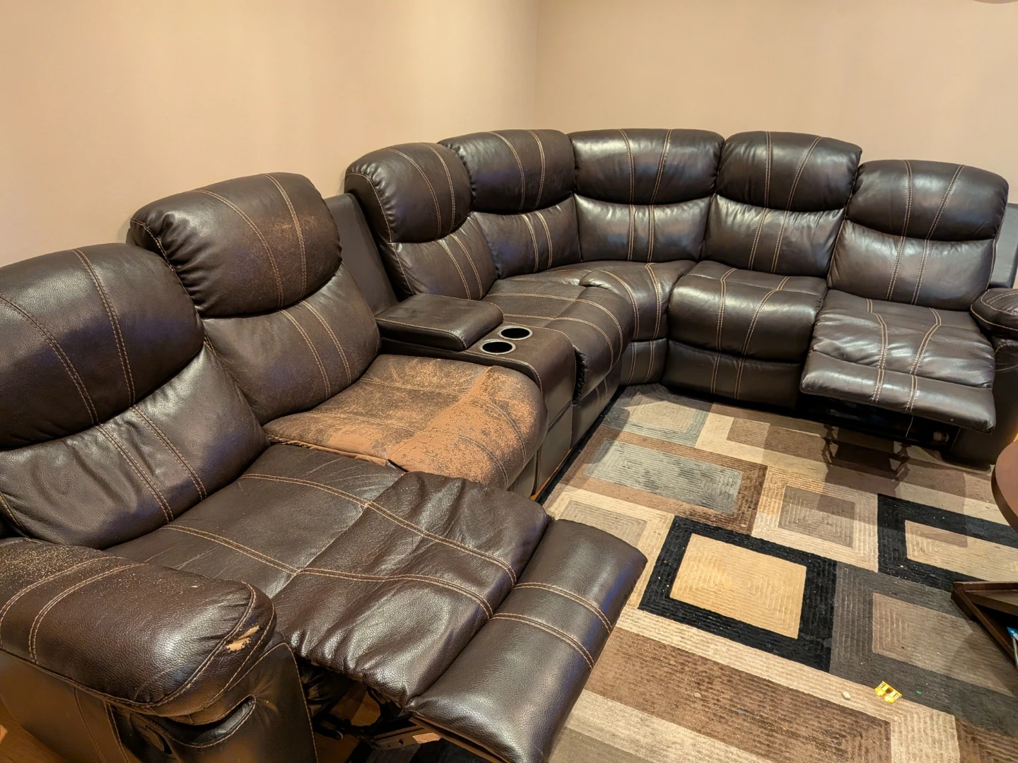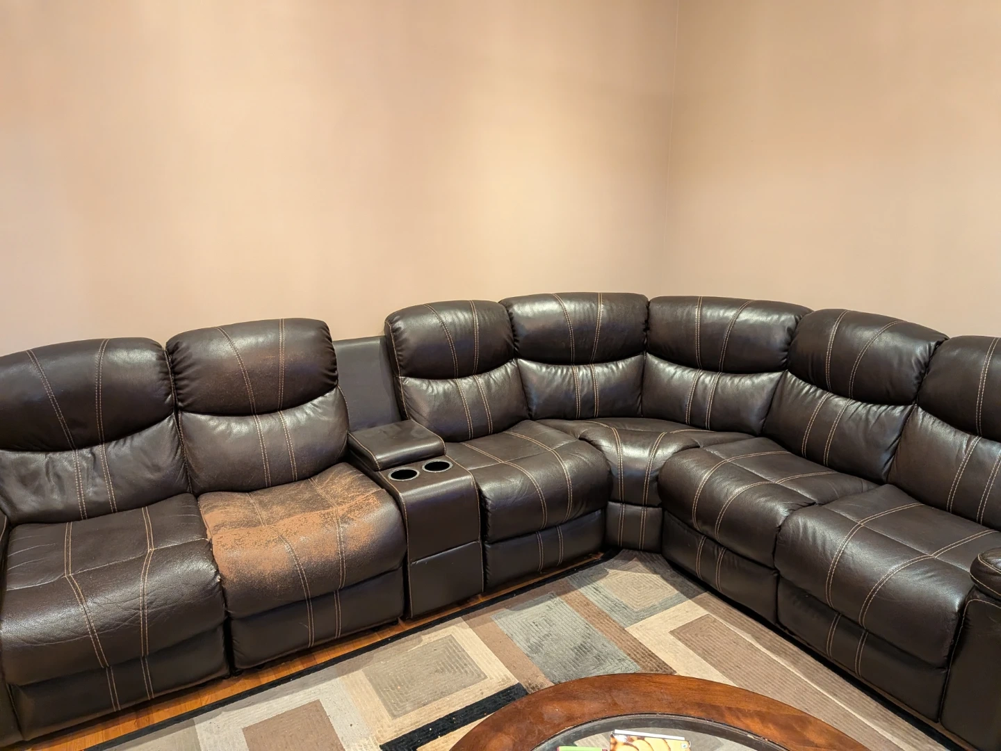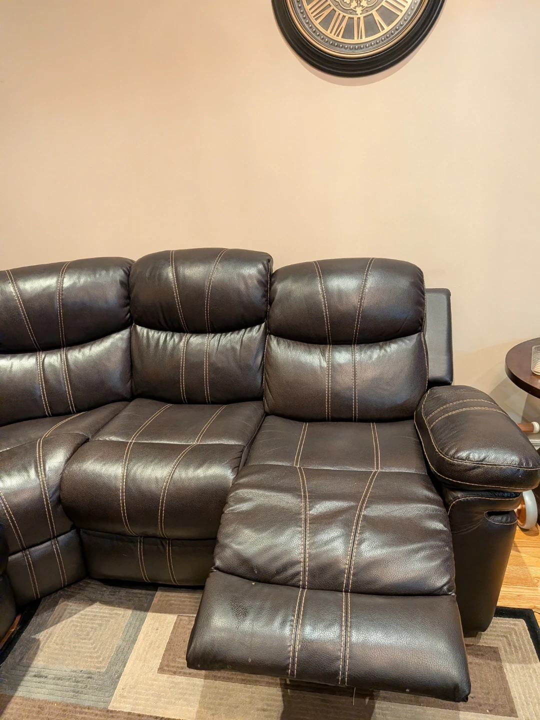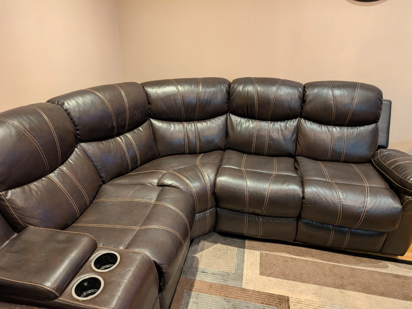 Selling a brown leather 6 seater sectional sofa. It features a recliner and cupholders for added comfort and convenience. Please note that there is some wear and tear on the seats as shown in the pictures.