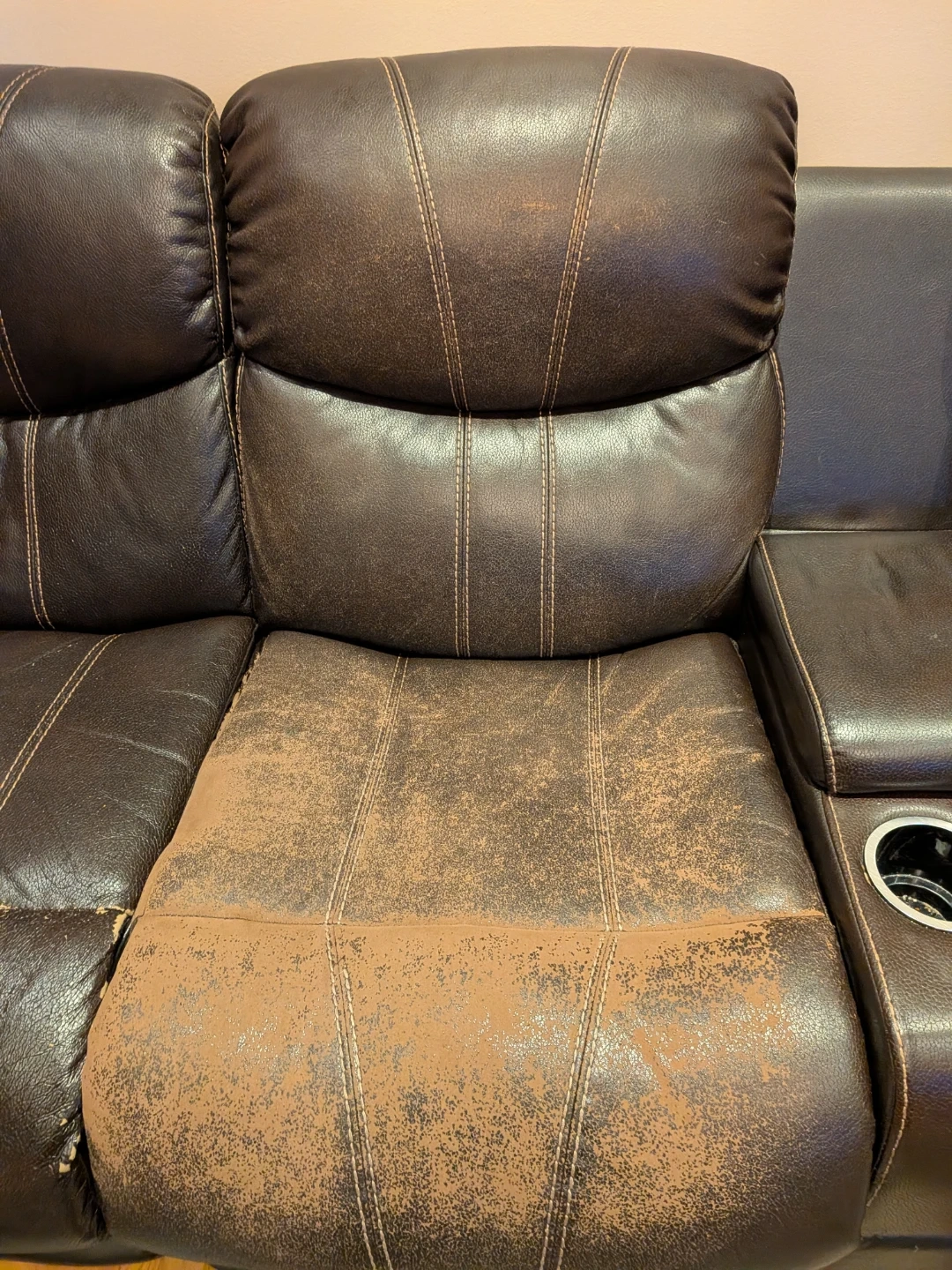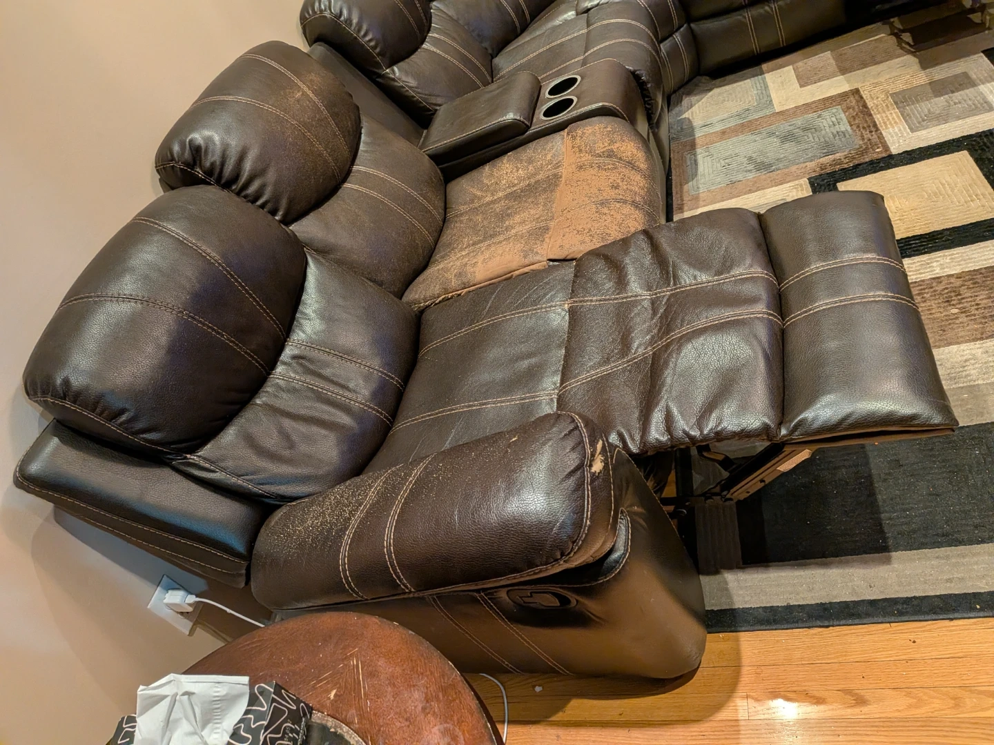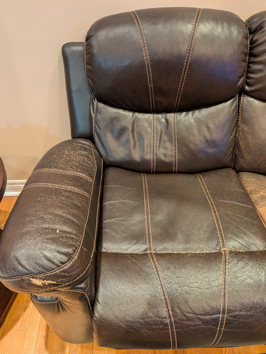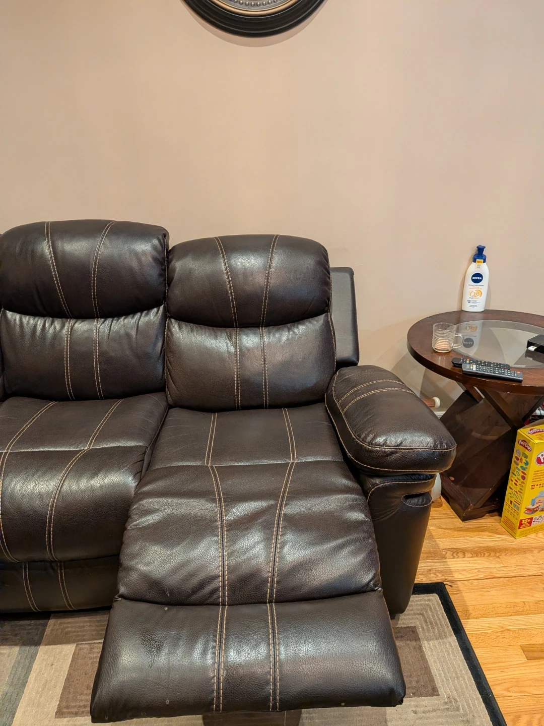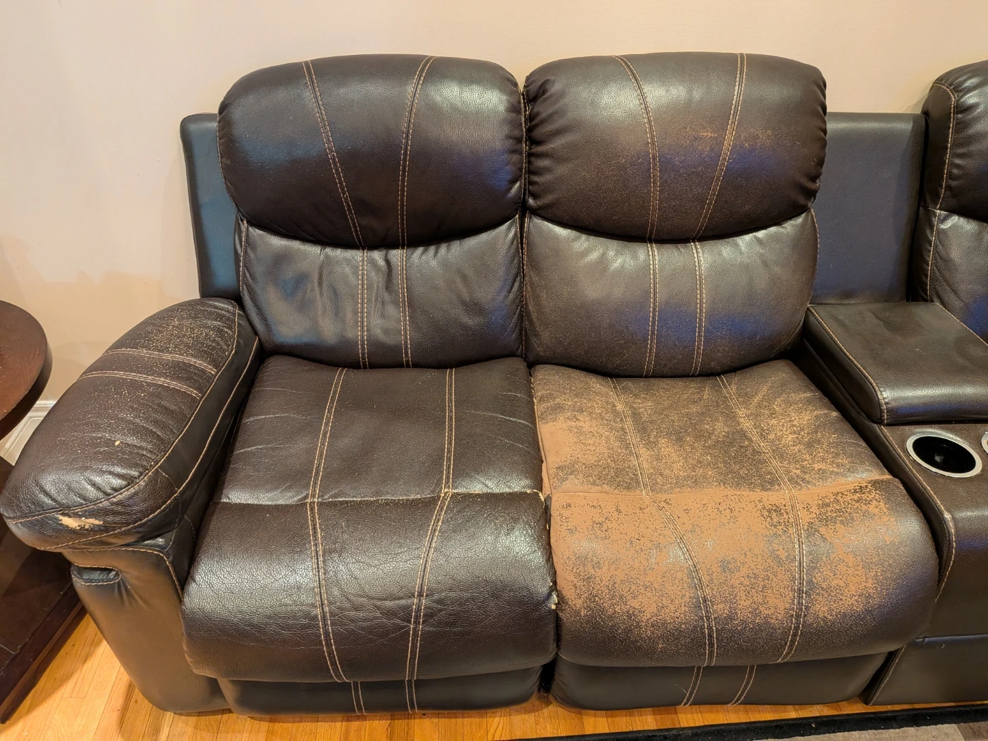 Selling a brown leather 6 seater sectional sofa. It features a recliner and cupholders for added comfort and convenience. Please note that there is some wear and tear on the seats as shown in the pictures.