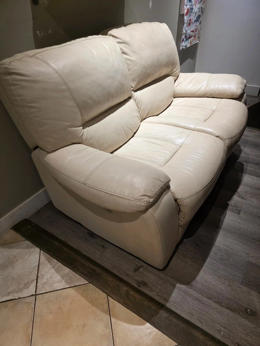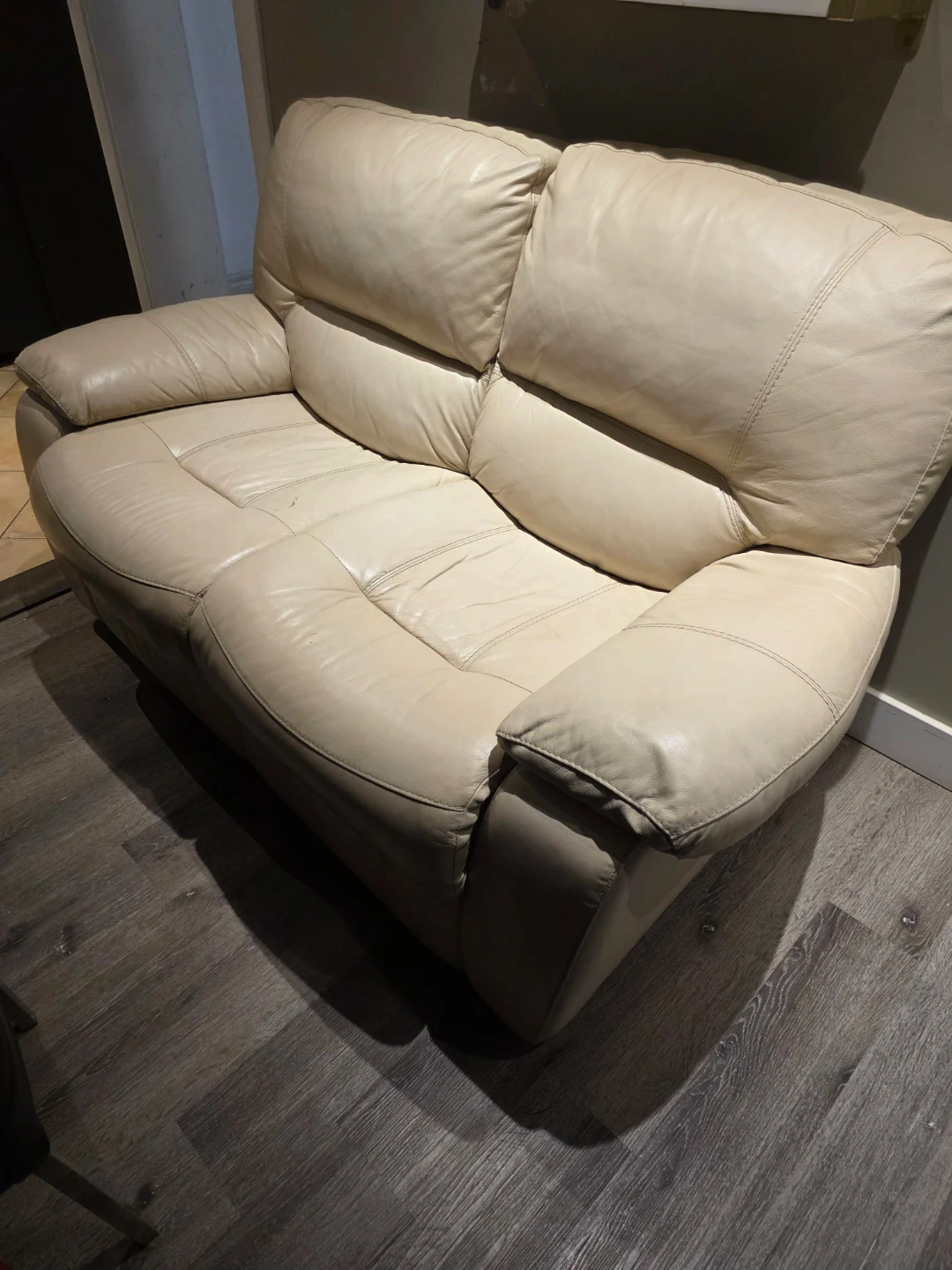 Cream leather loveseat in good condition. Perfect for a small space or apartment. Some signs of wear but overall very comfortable and stylish