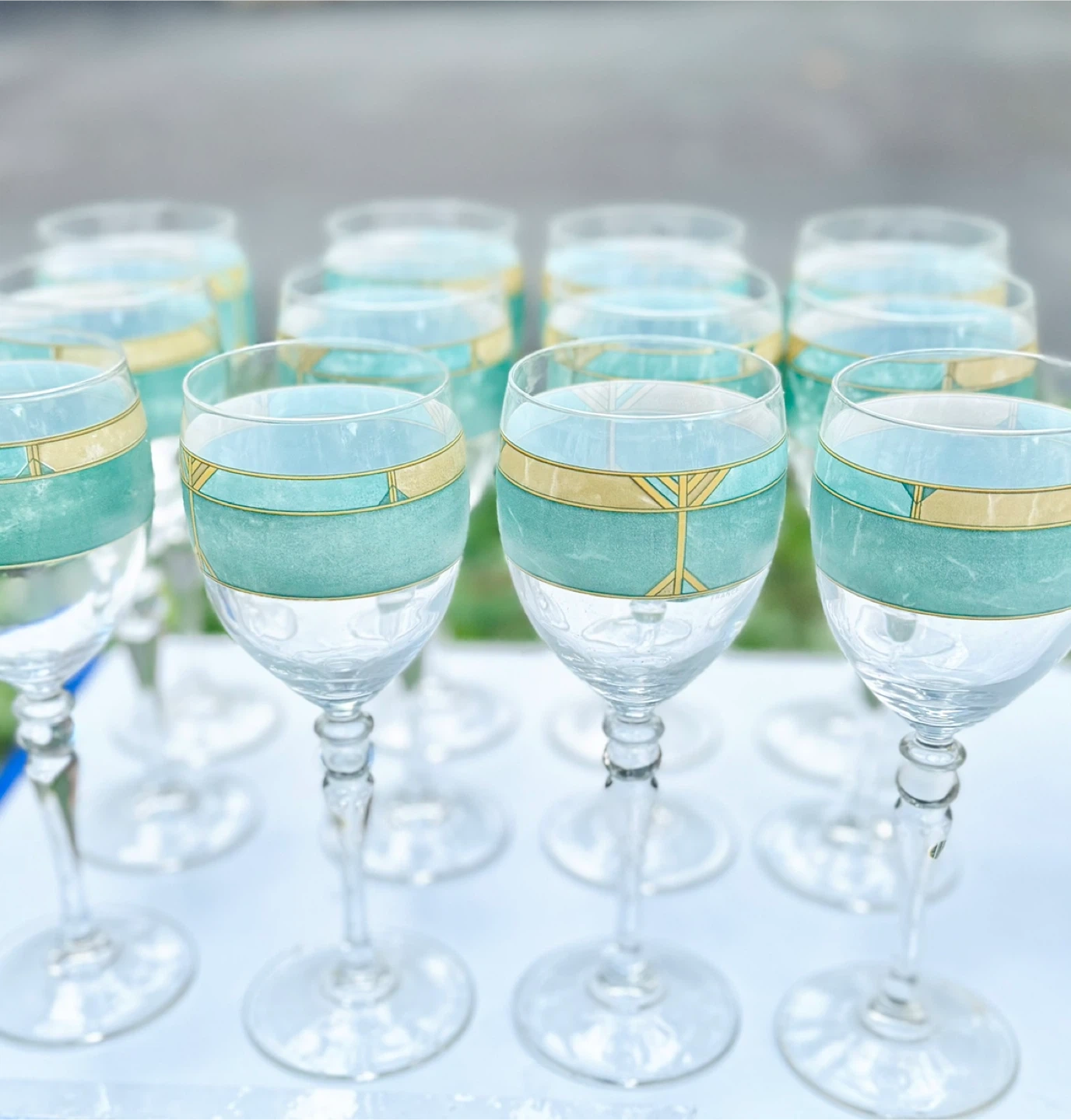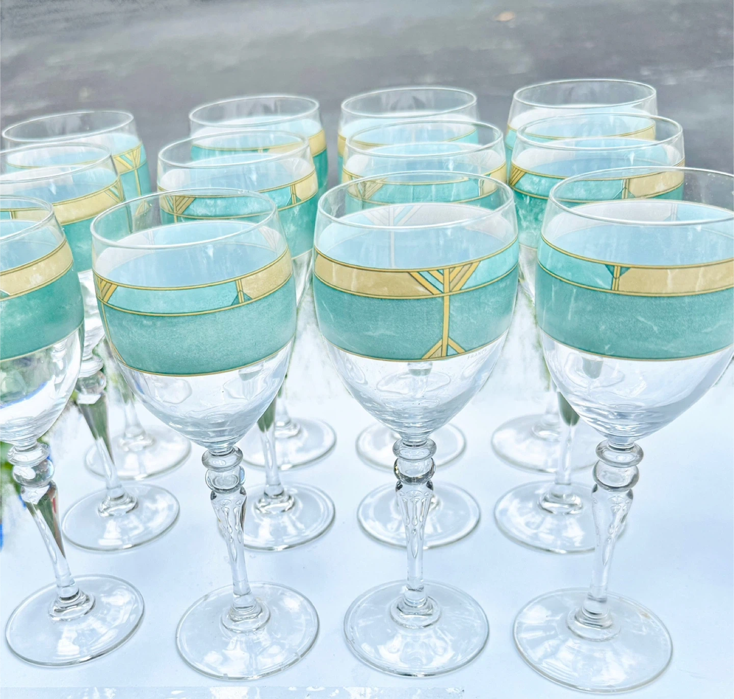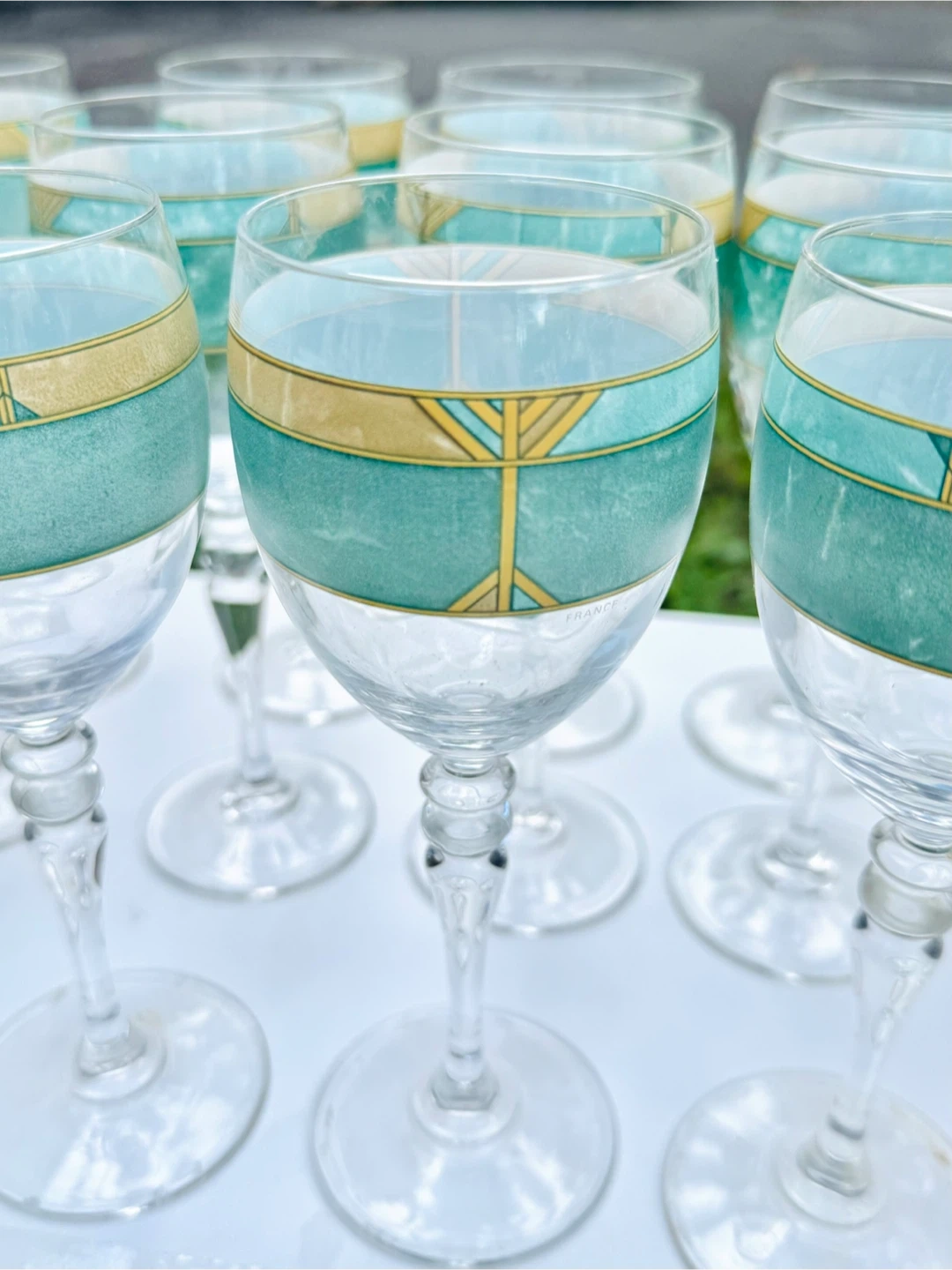 Selling a set of 12 vintage wine glasses from France! They feature a unique gold and teal design with a natural distressed look called Pompéi, adding a stylish touch to any occasion.