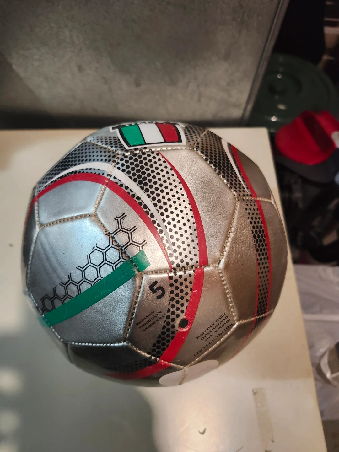Selling a FIFA World Cup Brazil 2014 soccer ball. It features the Italian flag and some other design elements in red, white, green, silver, and black. It's in good condition and ready for a new game!