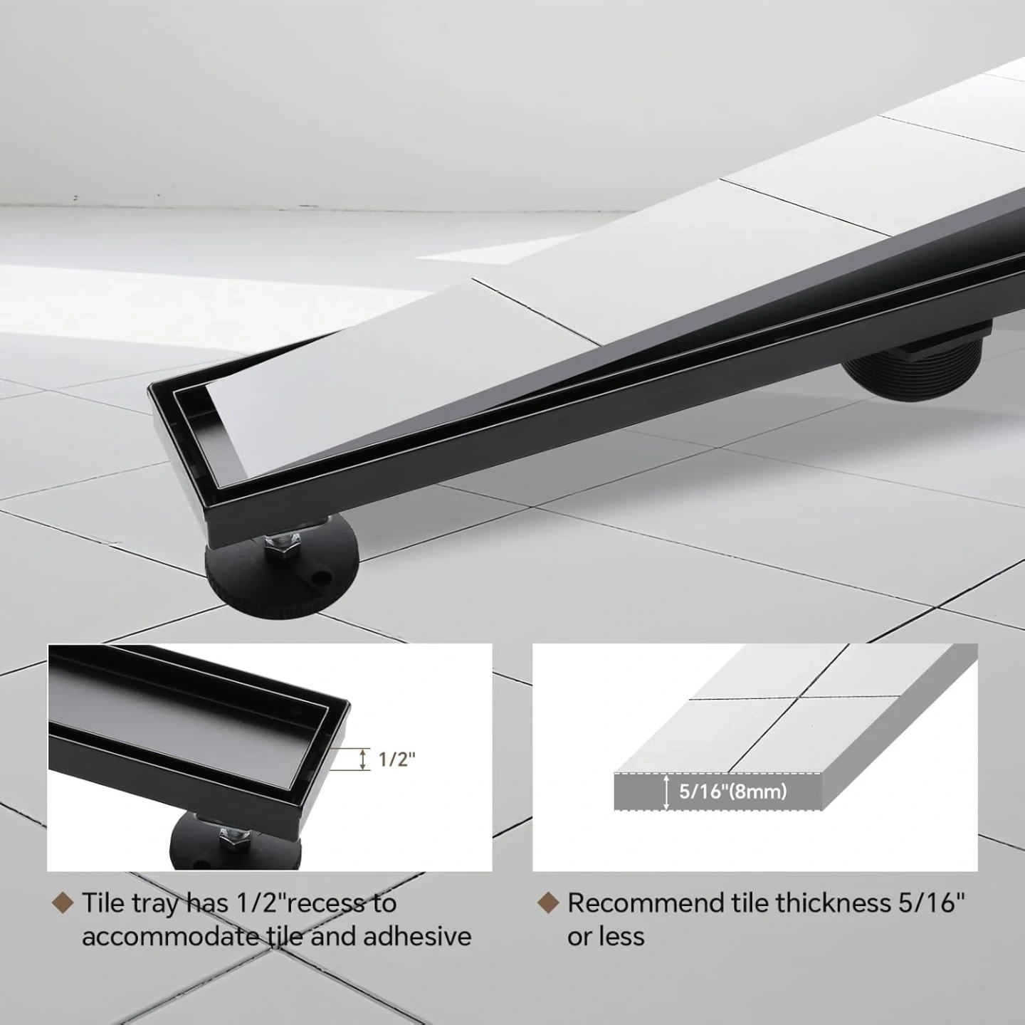 Linear Shower Drain with Tile-in Grate, Material Sus 304, Matt Black, 12 in Rectangle Floor Drain, Shower Floor Drain with Levelling Foot, Hair Strainer, for Bathroom, Balcony (Matt Black, 12 in), Brand New in the Box/Sealed