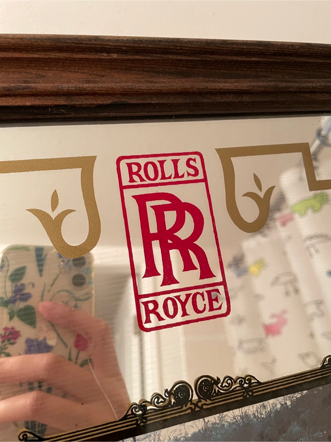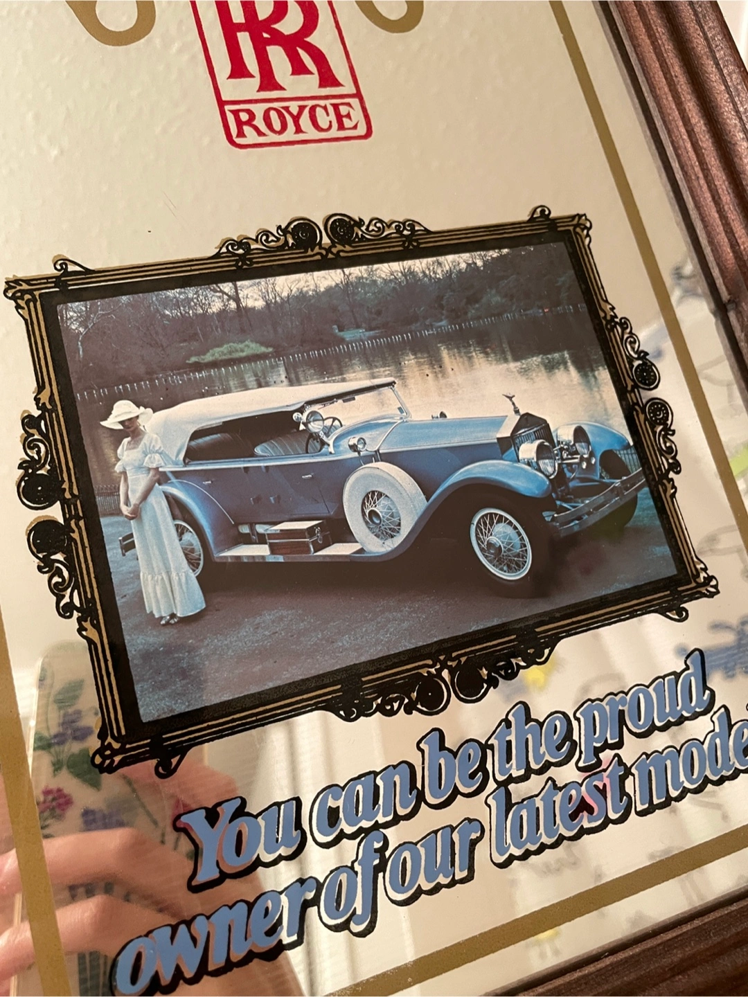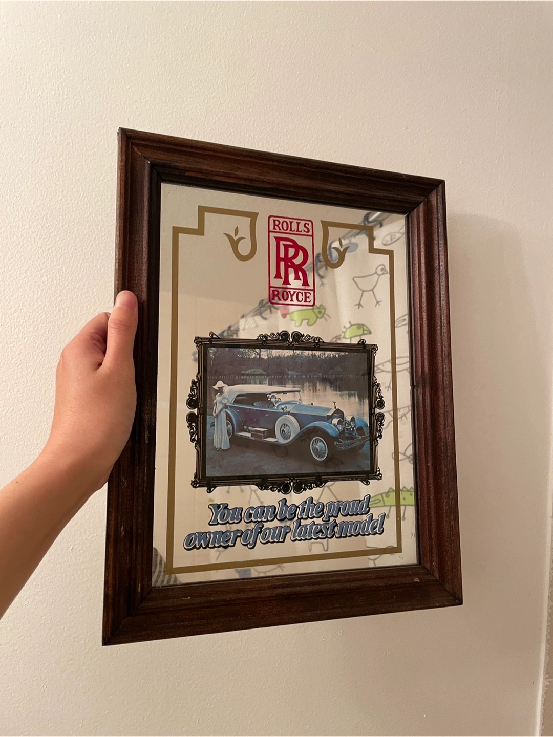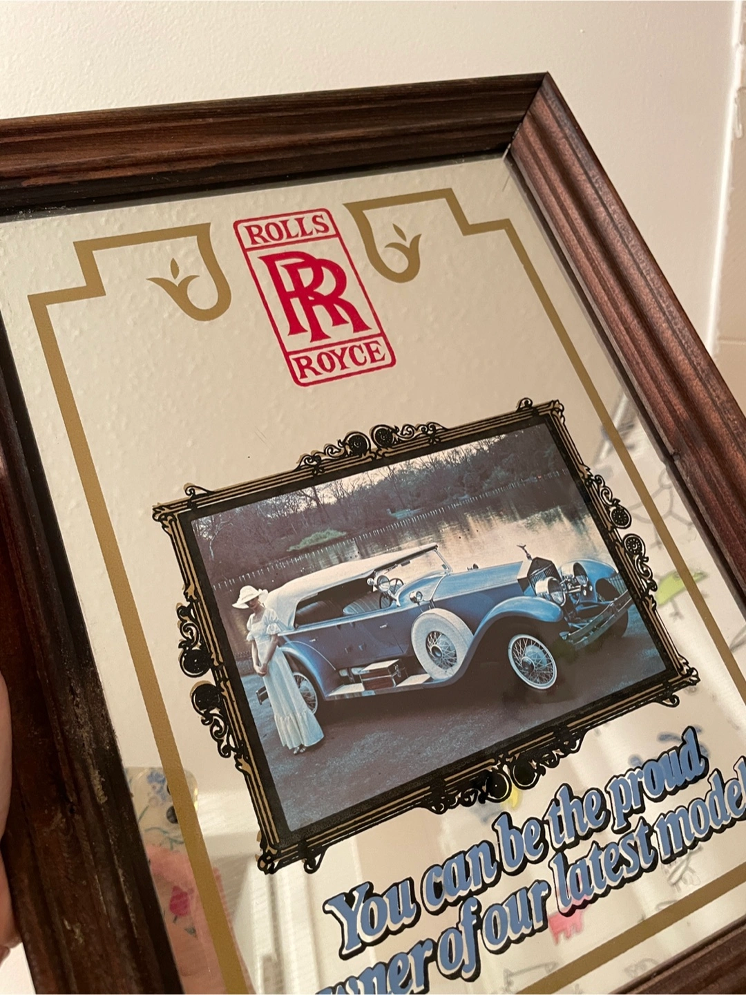 Selling a framed Rolls Royce mirror. It would look great in a garage, man cave, or any spot where you want to add a touch of classic automotive elegance! The frame is a dark wood tone, and the mirror features the iconic Rolls Royce logo and a vintage car image