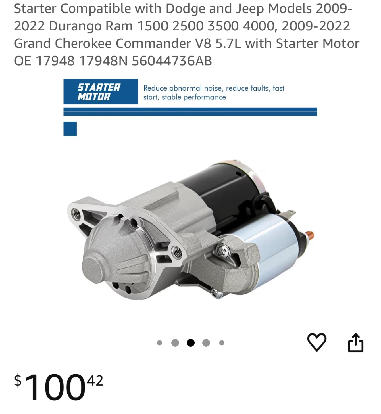 I'm selling a brand new EZEA Auto starter motor. It's compatible with Dodge and Jeep models from 2009-2022, including Durango and Ram 1500, 2500, 3500, 4000, Grand Cherokee V8 5.7L. The OE number is 17948 17948N 56044736AB.