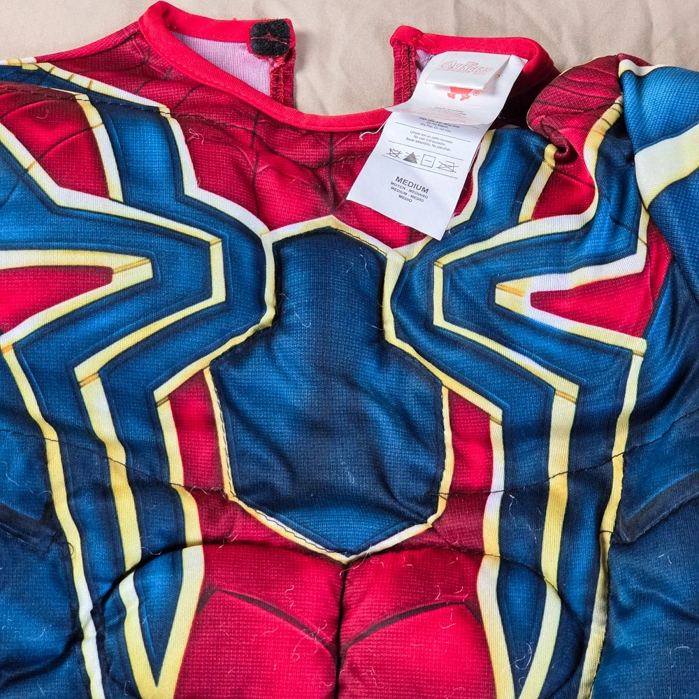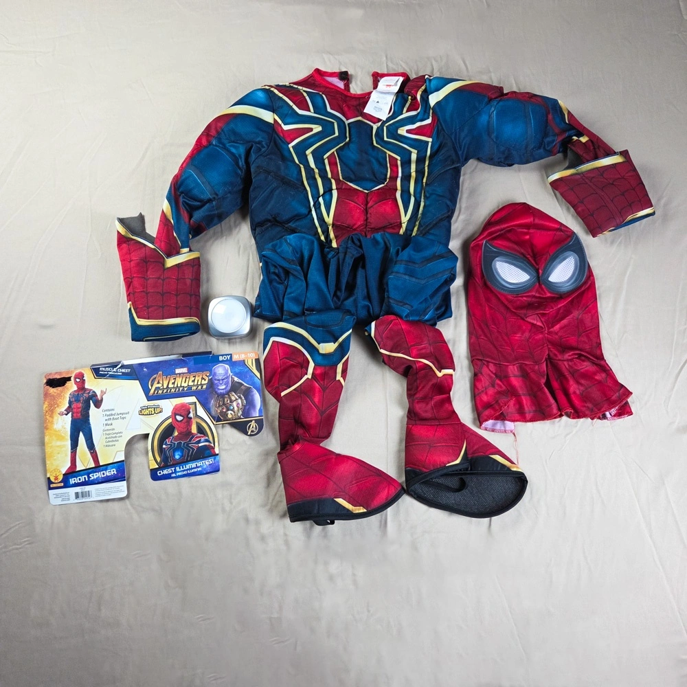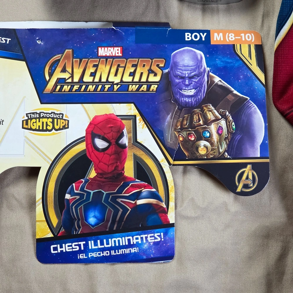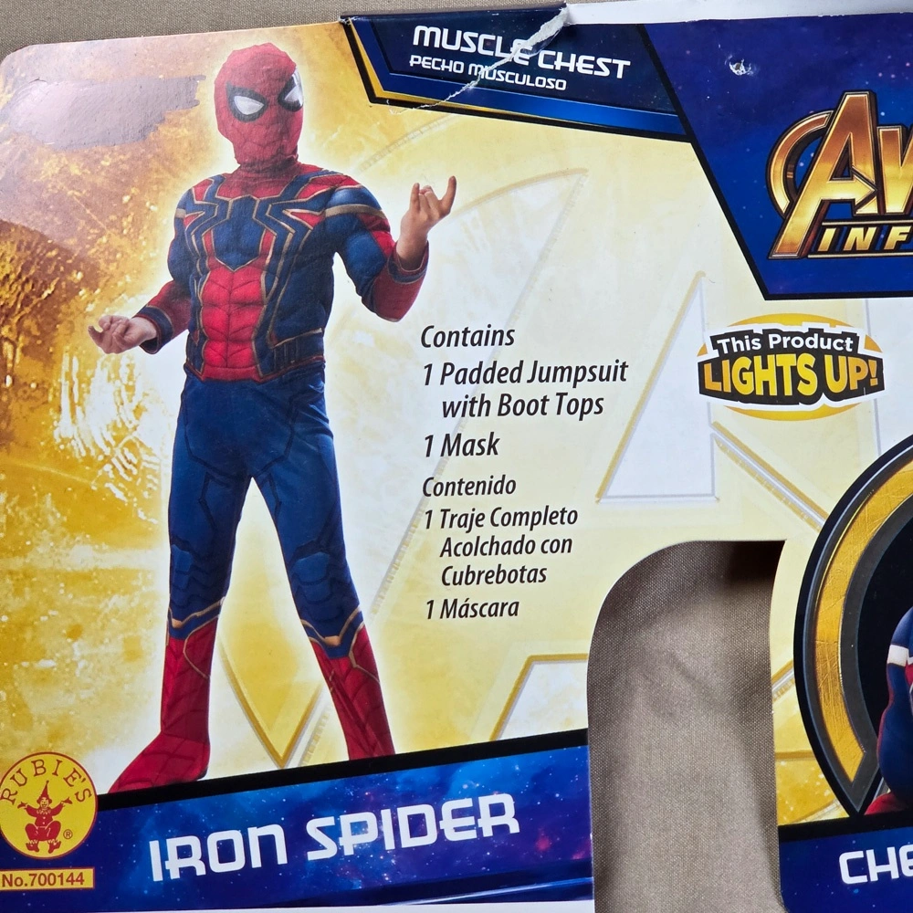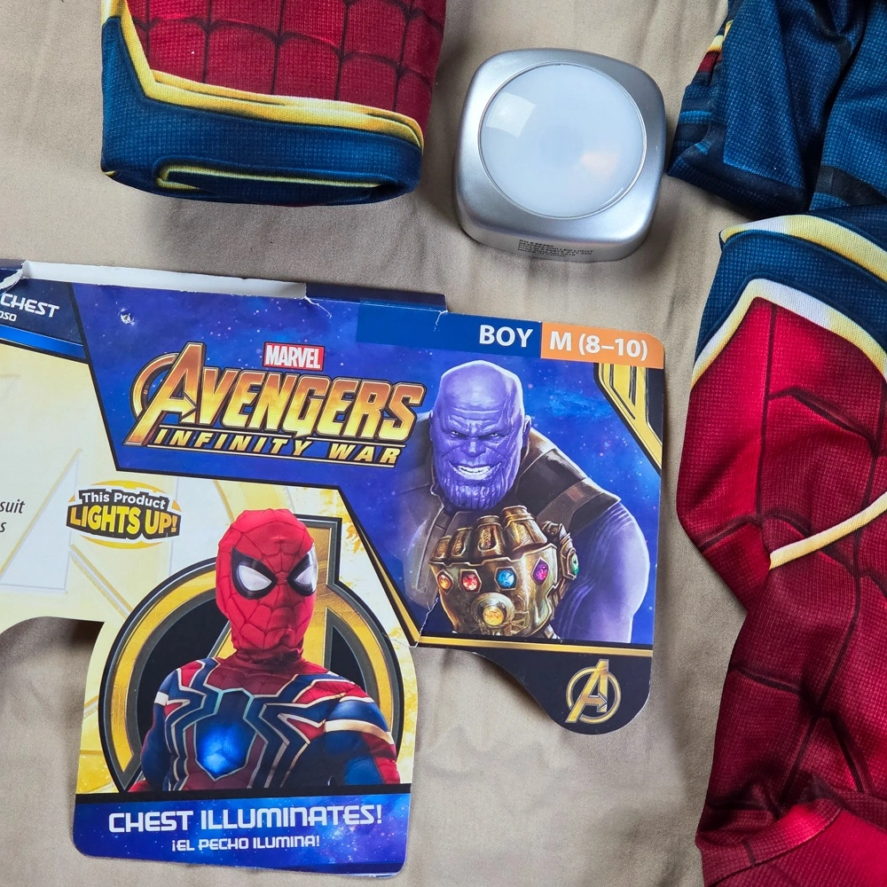 Marvel Avengers Infinity War Iron-Spider Spiderman Boys Superhero Halloween Costume Deluxe. The chest illuminates, takes 3 AAA batteries.
