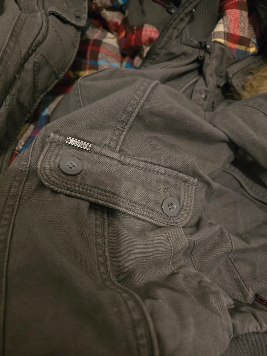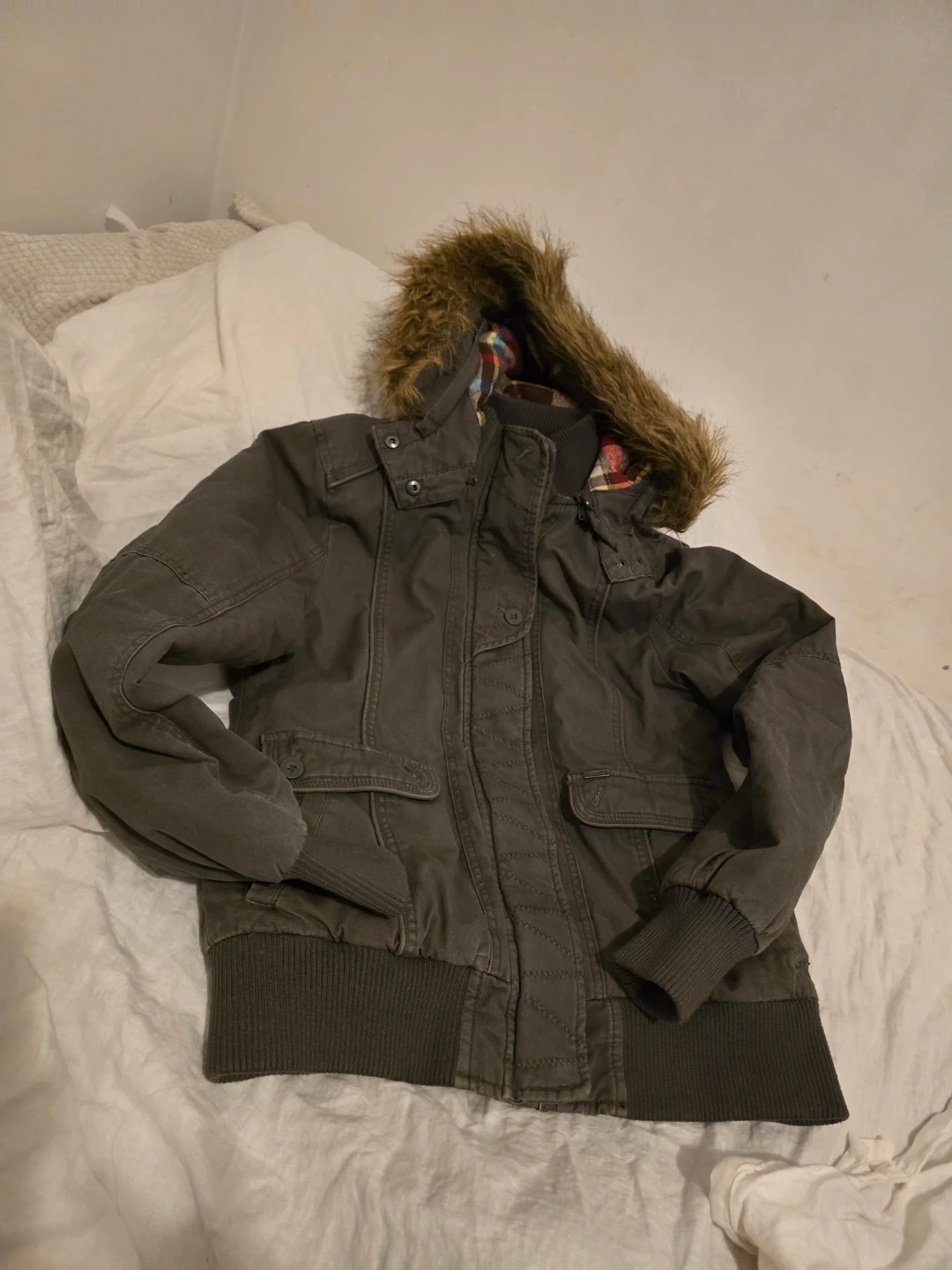 Selling a Katie winter jacket with a fur hood. It's a stylish and warm jacket, perfect for the Canadian winter. The jacket is in good condition and features a plaid lining.