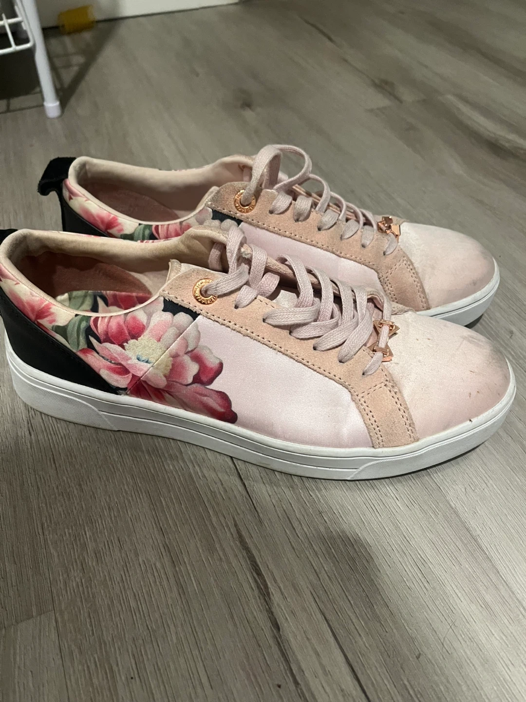 Selling a pair of Ted Baker London sneakers! They are a light pink colour with a floral design on the back. These are a women's size 8 and have some wear and tear, as shown in the photos.