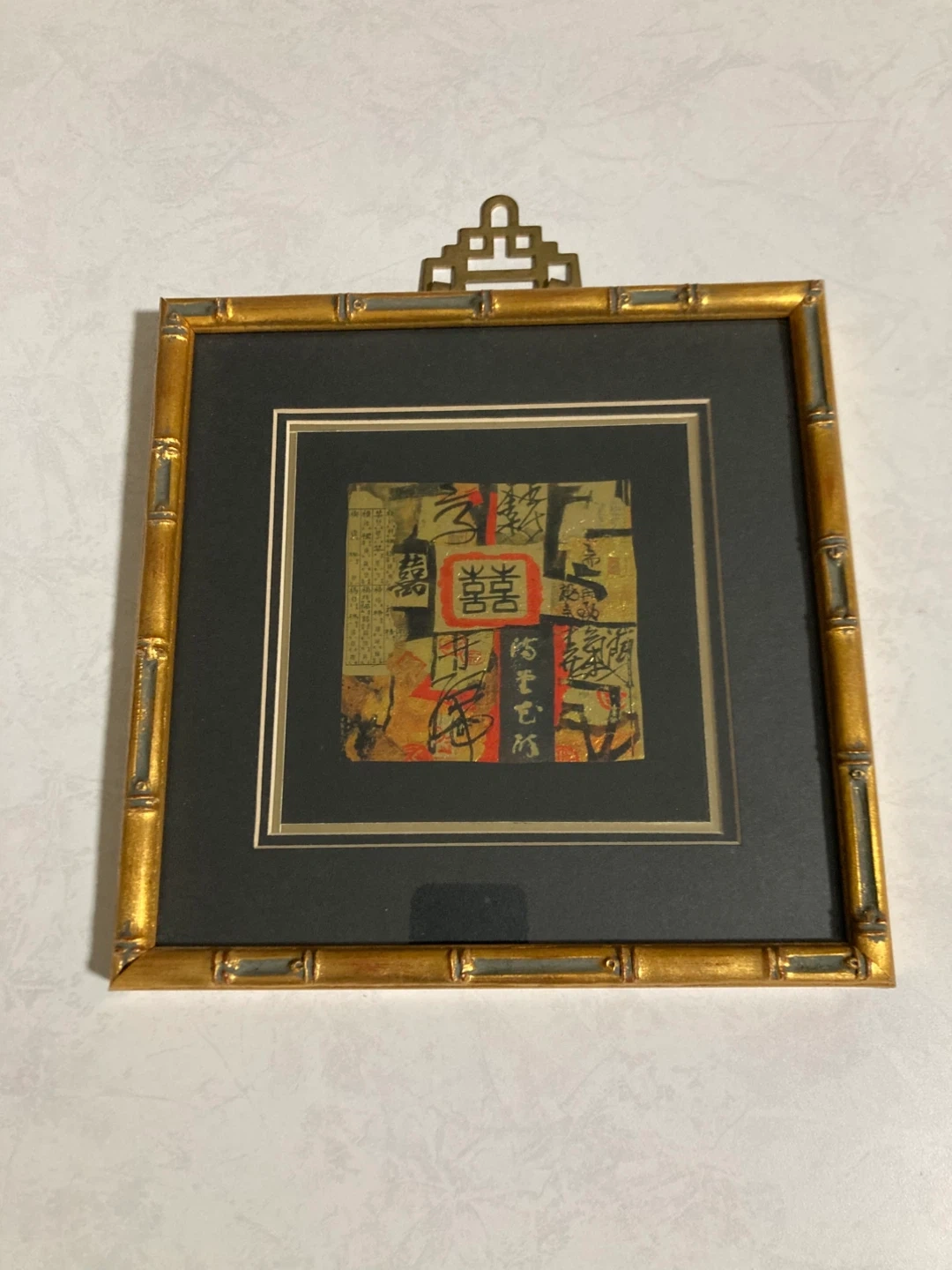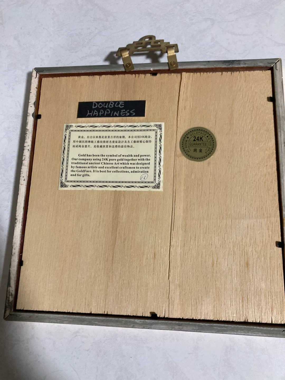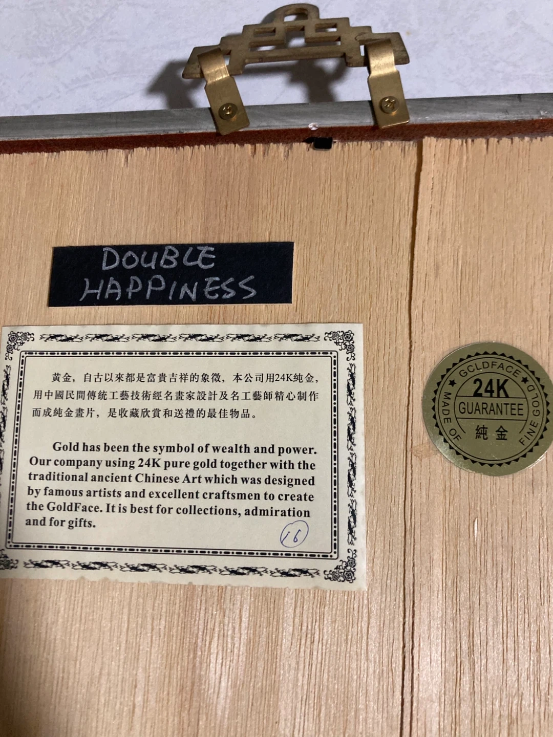 Selling a framed piece of art with a "Double Happiness" theme. It features 24K pure gold and traditional Chinese art. The back has a label explaining the symbolism of gold and the craftsmanship involved. A unique piece for collections or as a gift